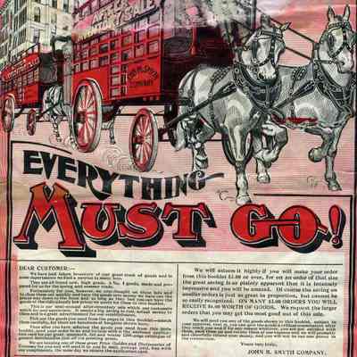 Two horse-drawn wagons above "Everything Must Go!"