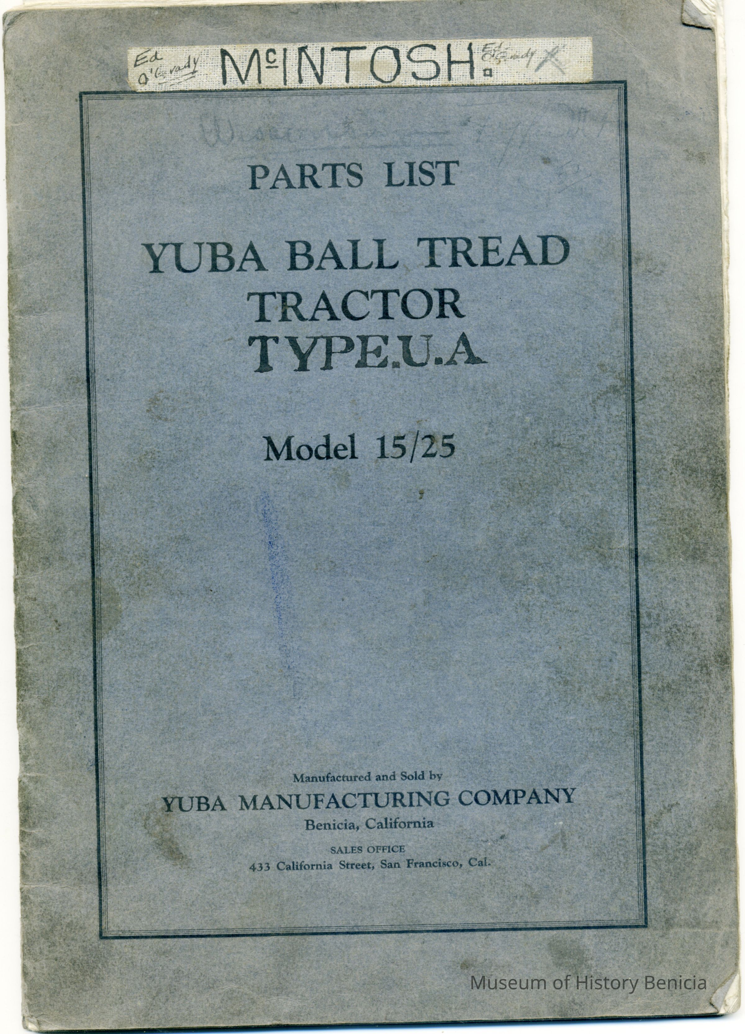33 page catalog of the Model 15-25 Ball Tread Tractor from Yuba. The owner's name on the front is McIntosh and then Ed O'Grady. It contains parts for this device.Collection