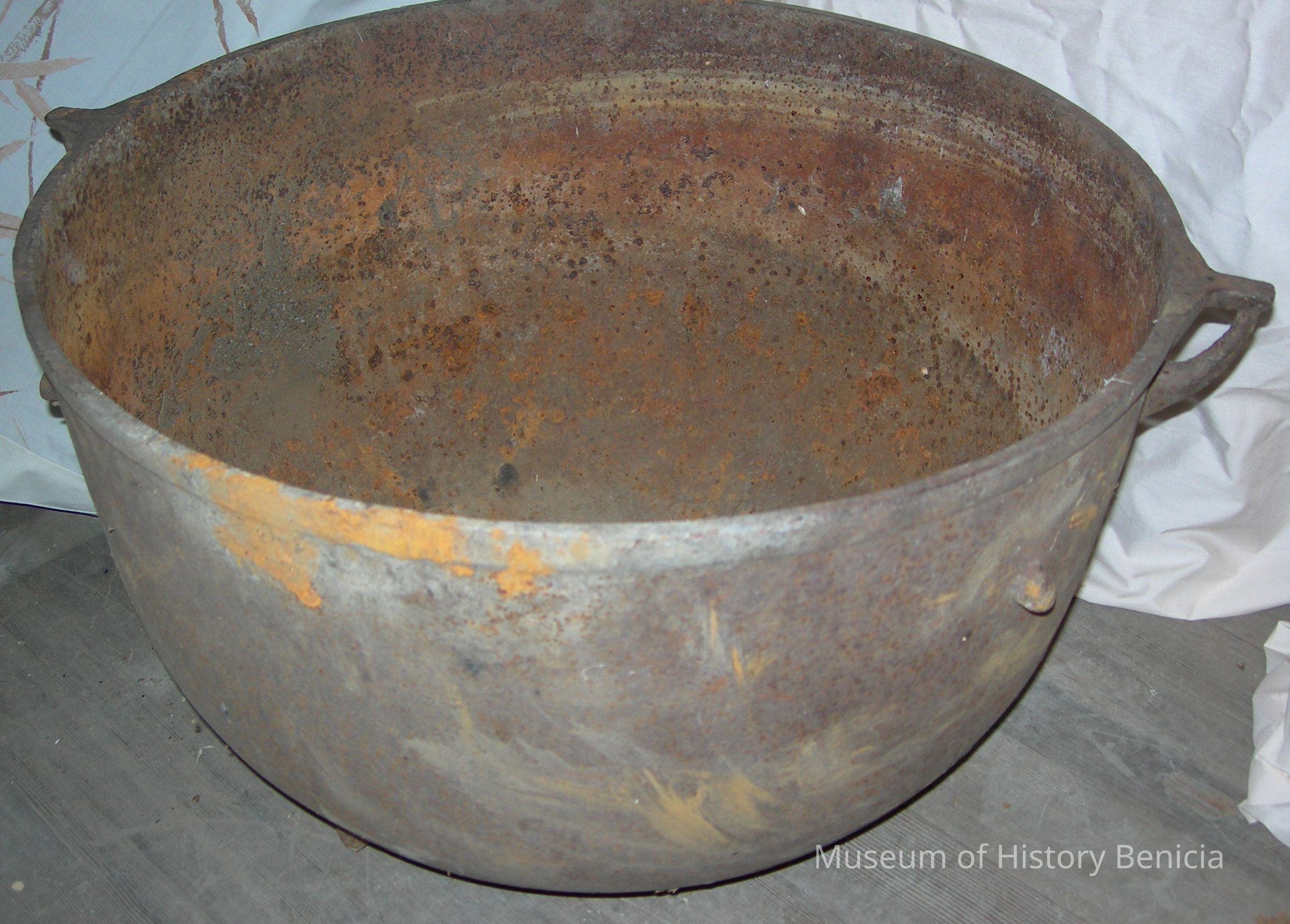 cast iron cauldron, rounded bottom, three small feet to keep it from tipping two loop handles at opposite sides top rim