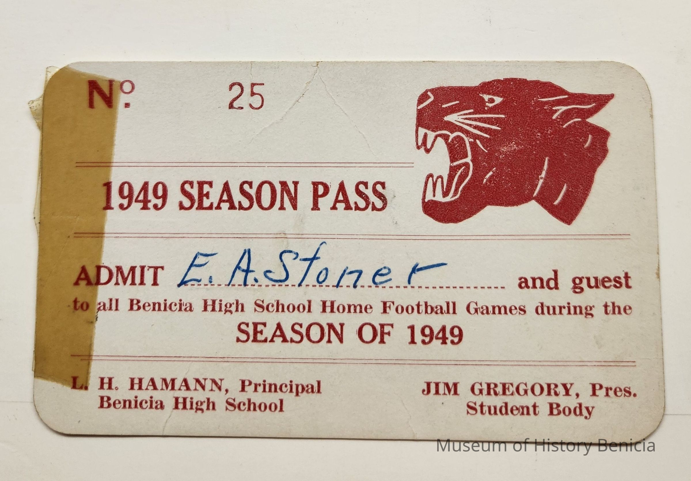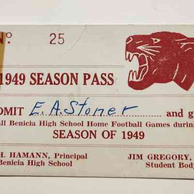 No 25 / 1949 Season Pass / Admit E.A. Stoner (in blue ink) and guest / to all Benicia High School Home Football Games during the / Season of 1949 / L. H. Hamann, Principal Jim Gregory, Pres. / Benicia High School Student Body.Collection
