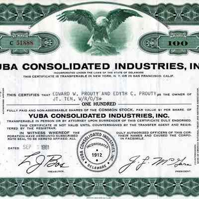 Rectangle of white paper with green engraved borde; printed in black "Yuba Consolidated Industries, Inc." / "This certifies that Edward W. Prouty and Edyth C. Prouty Jt. Ten. W/R/O/S* as the owner of One Hundred fully paid and non-assessable shares of the common stock, par value $1 per share of Yuba Consolidated Industries, Inc.";