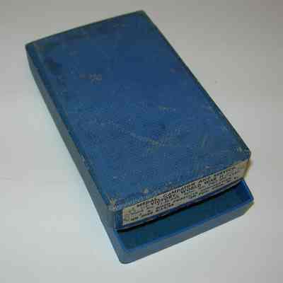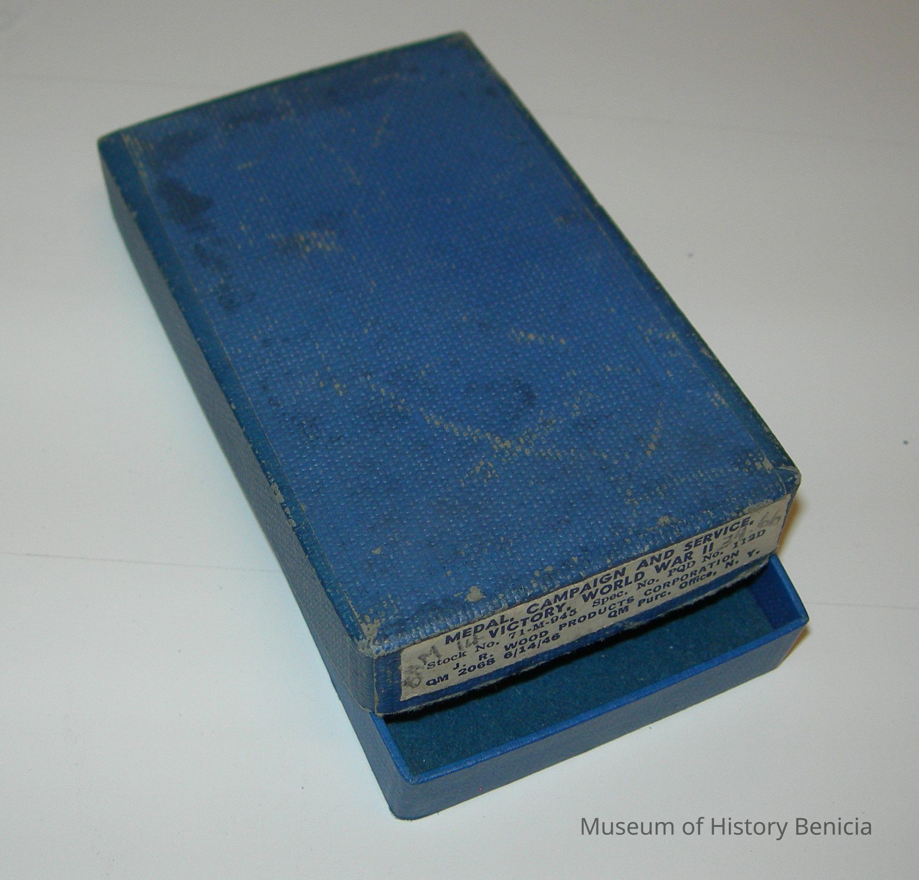 Storage box for Victory World War II Medal and Ribbon; Blue with white label: "Medal, Campaign and Service, Victory, World War II, Stock No. 71-M-945 Spec. No. PQD No. 112D, J.R. Wood Products Corporation QM 2068 6/14/46 QM Purc. Office, N.Y." 3-3/4" x 2-3/8" x 1/2"