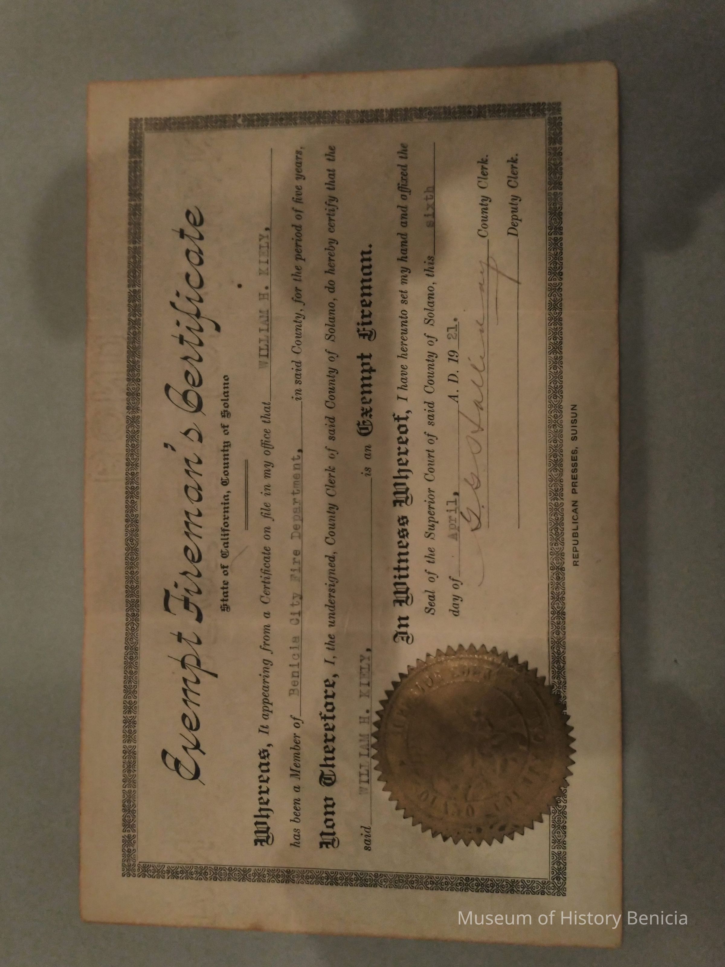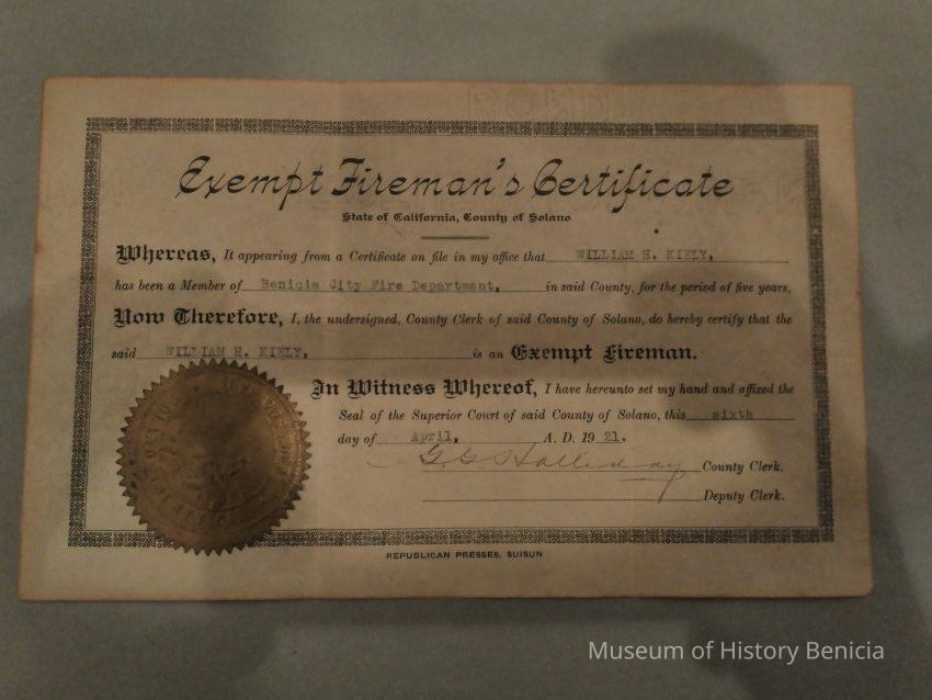 Exempt Fireman's Certificate - William H. Kiely