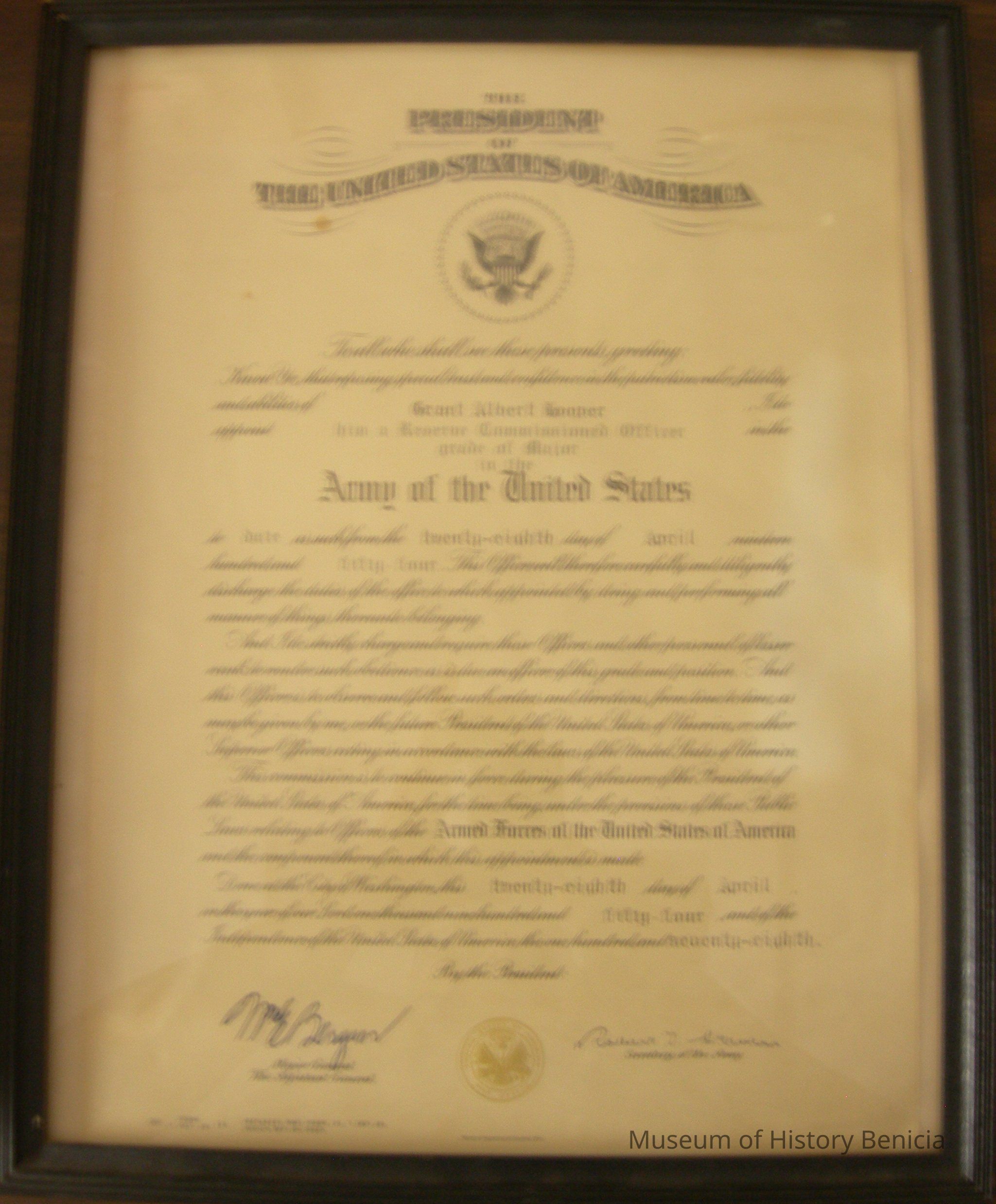 Certificate: The President of the United States of America, "To all who shall see these presents, greeting: Know Ye, that reposing special trust and confidence in the patriotism valor, fidelity and abilities of Grant Albert Hooper, I do appoint him as a Reserve Commissioned Officer in the Officers' Reserve Corps in the Army of the United States in the grade of Major to date as such from the twenty-eighth day of April nineteen hundred fifty-four."