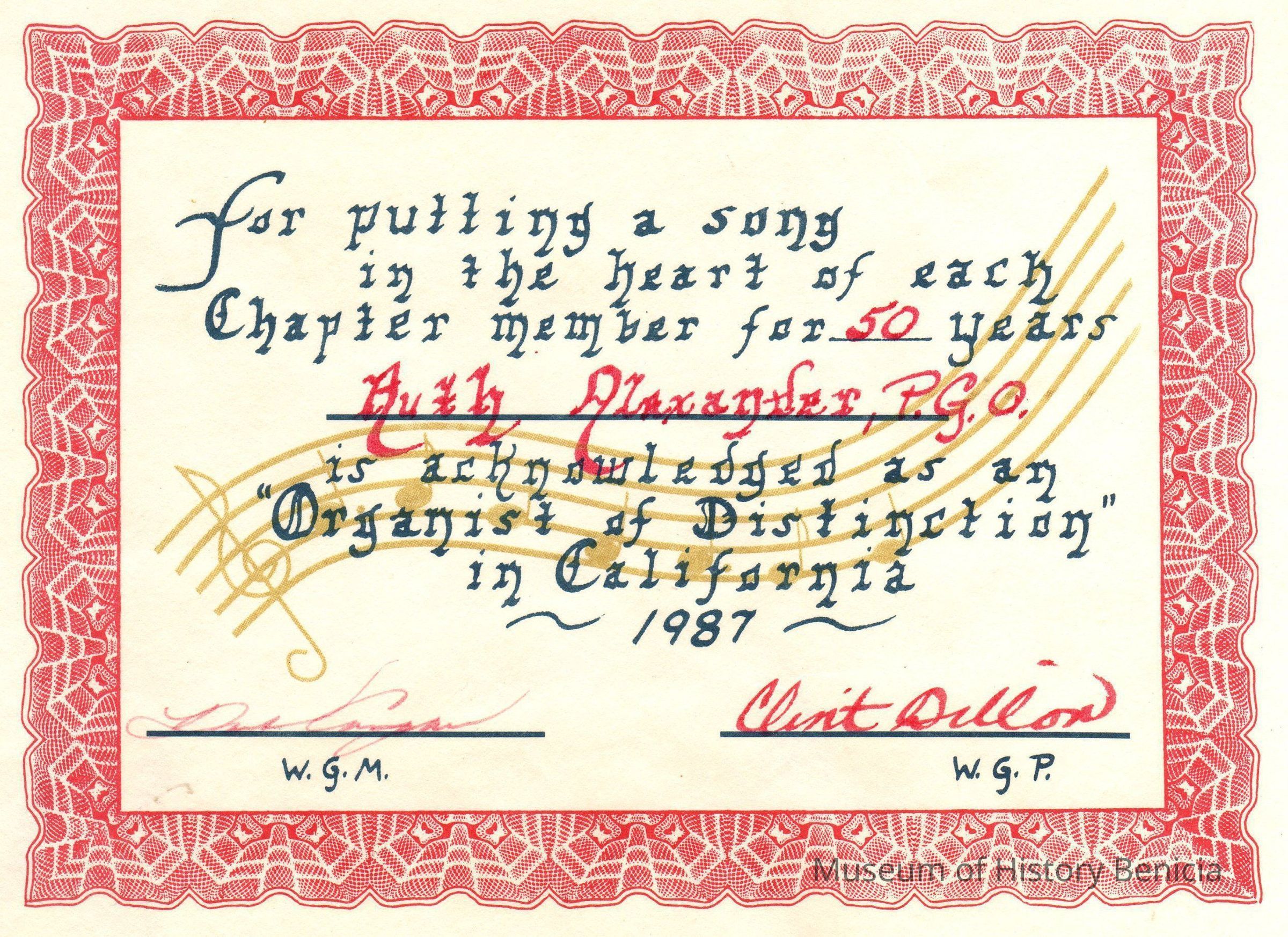 an "Organist of Distinction" in California - 1987 -