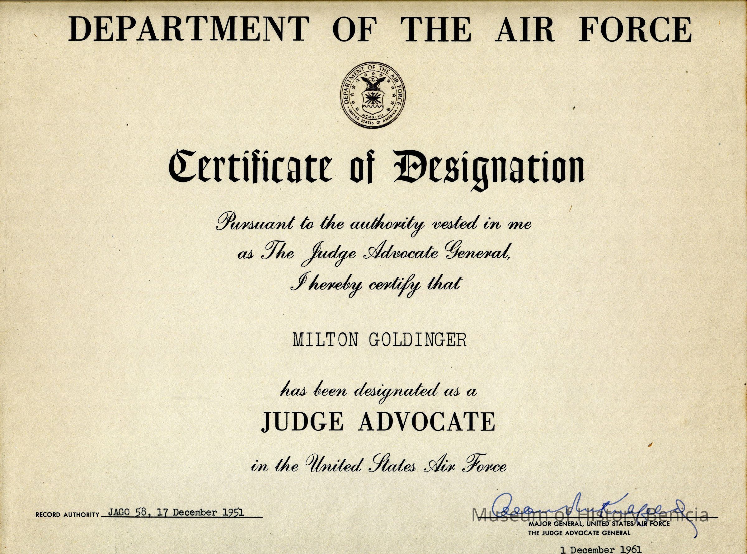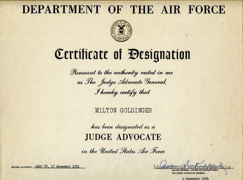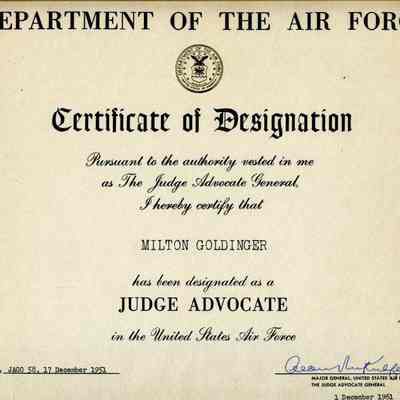 Certificate of Designation from the Department of the Air Force from the Judge Advocate General to Milton Goldinger being designated as a Judge Advocate.Collection