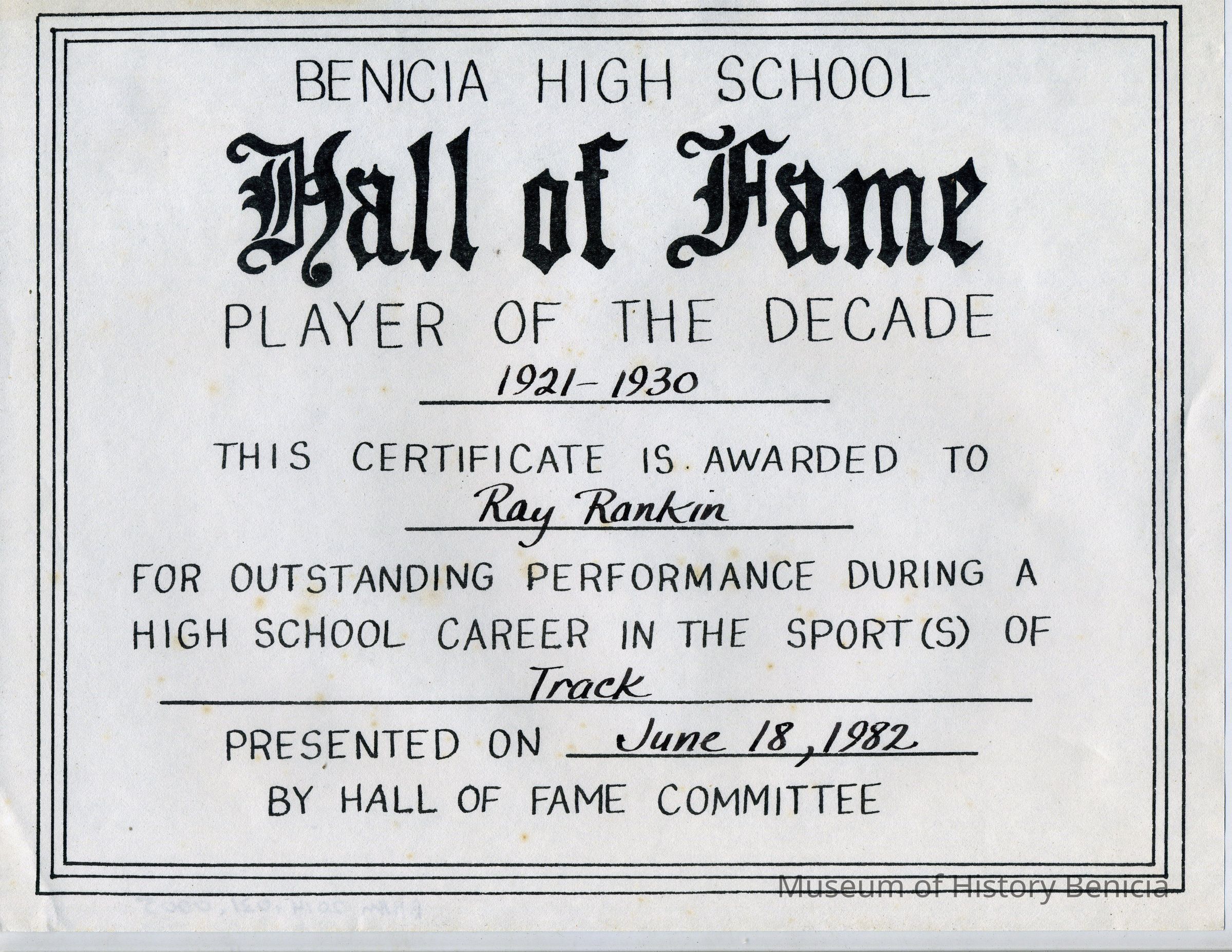 Certificate from Benicia High School for Player of the Decade and admission to the Hall of Fame for Ray Rankin. Dated 06/18/1982 for the sport of track.Collection