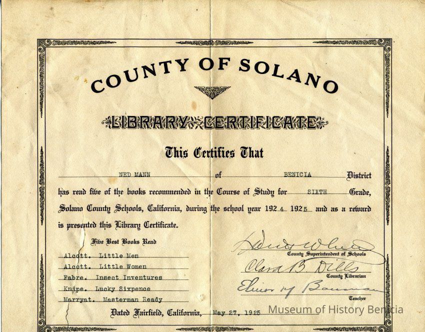 A certificate given to Ned Mann by the Solano County Library for reading 5 books when he was in the sixth grade.