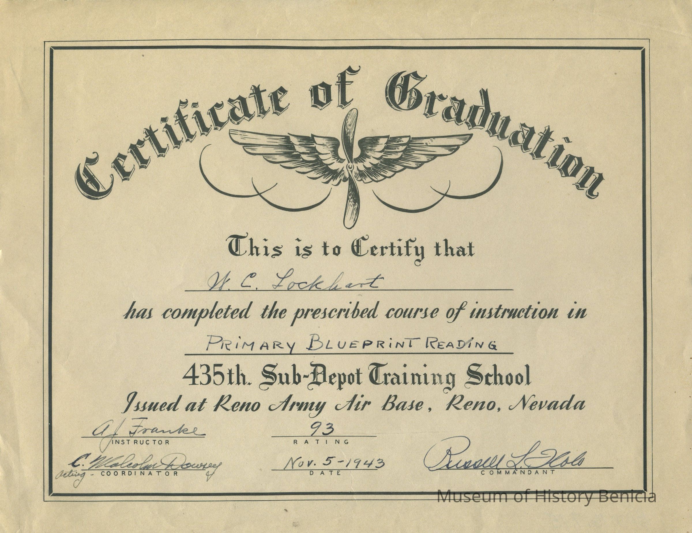 Certificate of Graduation certifies that W. C. Lockhart completed the course of instruction in Primary Blue Print Reading at 435th Sub Depot Training School at Reno Army Air Base, Reno, Nevada