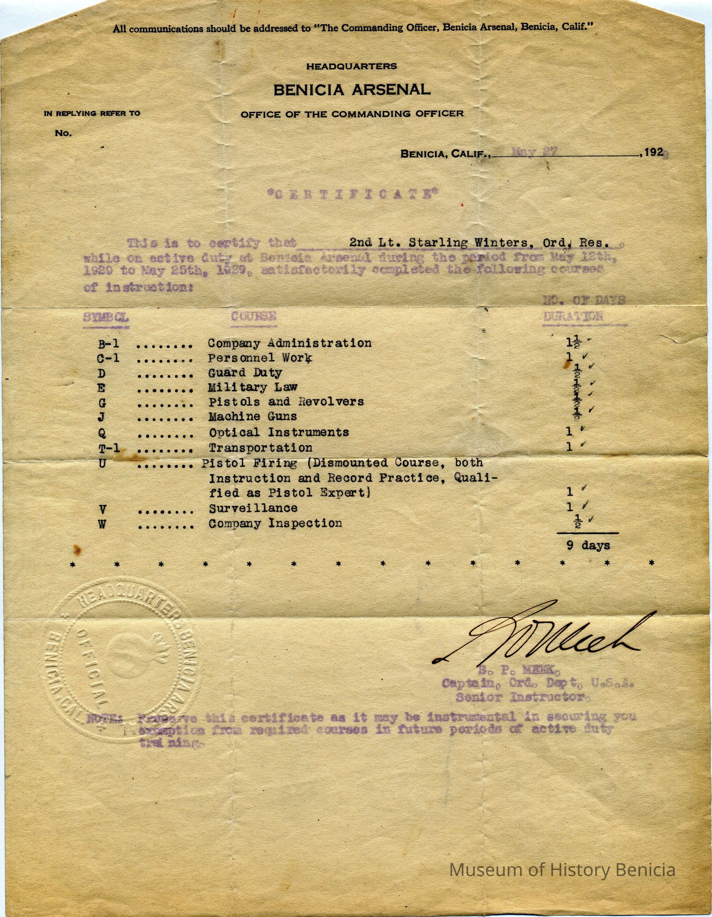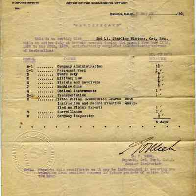 A certificate of training for 2nd Lt. Starling Winters of the Benicia Ordnance Res. The certificate is signed by Captain S.P. Meek a senior instructor at the Benicia Arsenal. It is dated 05/27/1929.