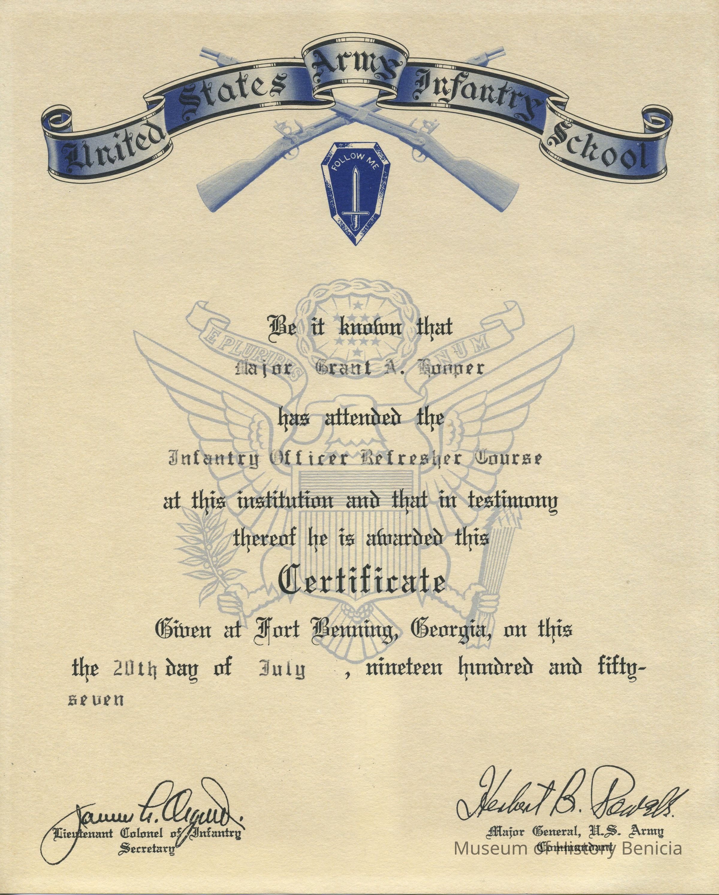 Certificate: U.S. Army Infantry School, Major Grant Hooper attended "Infantry Officer Refresher Course" at Fort Benning, Georgia on the 20th day of July 1957