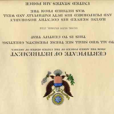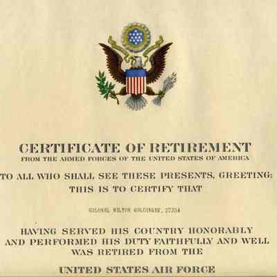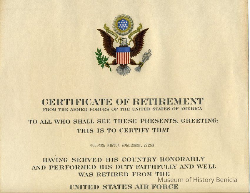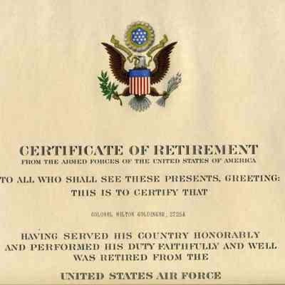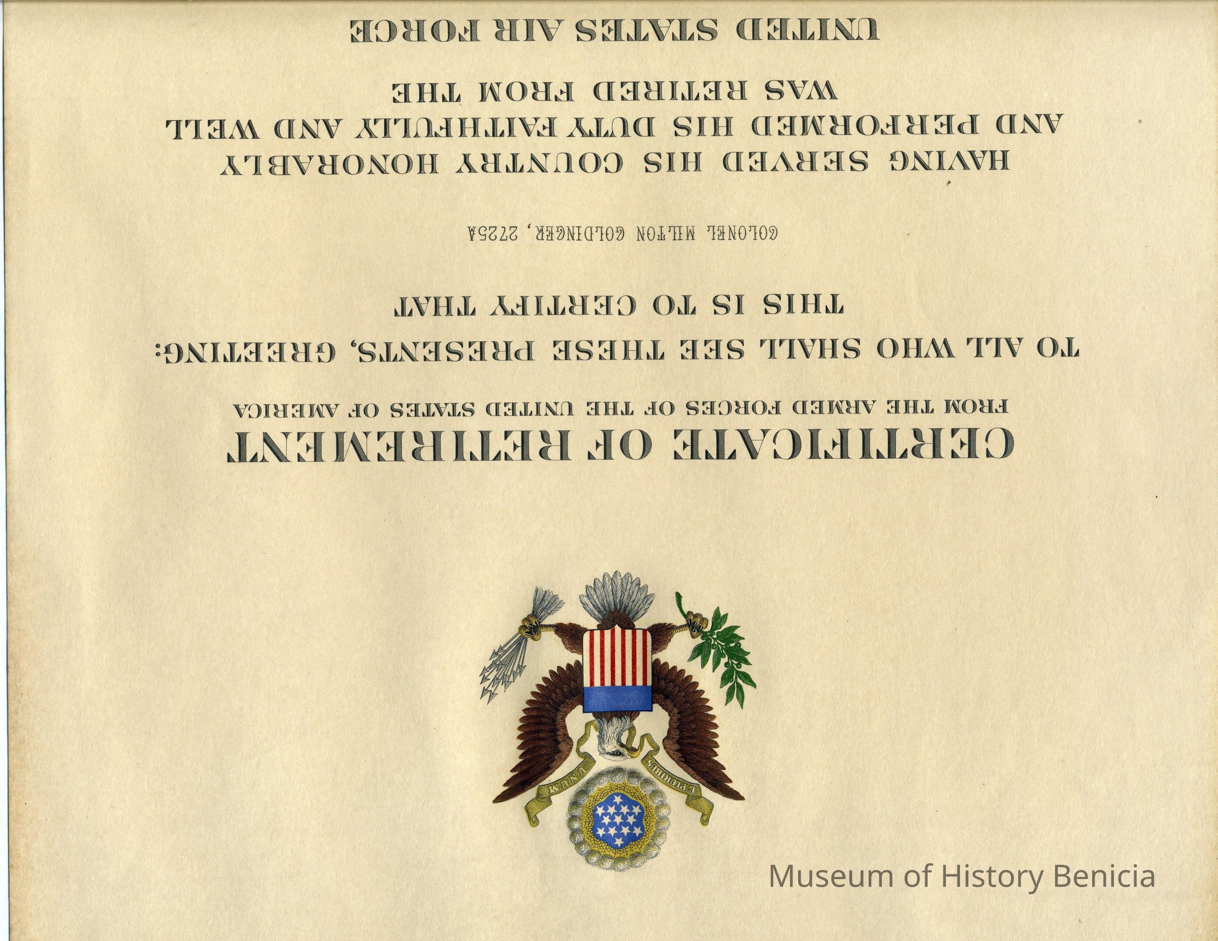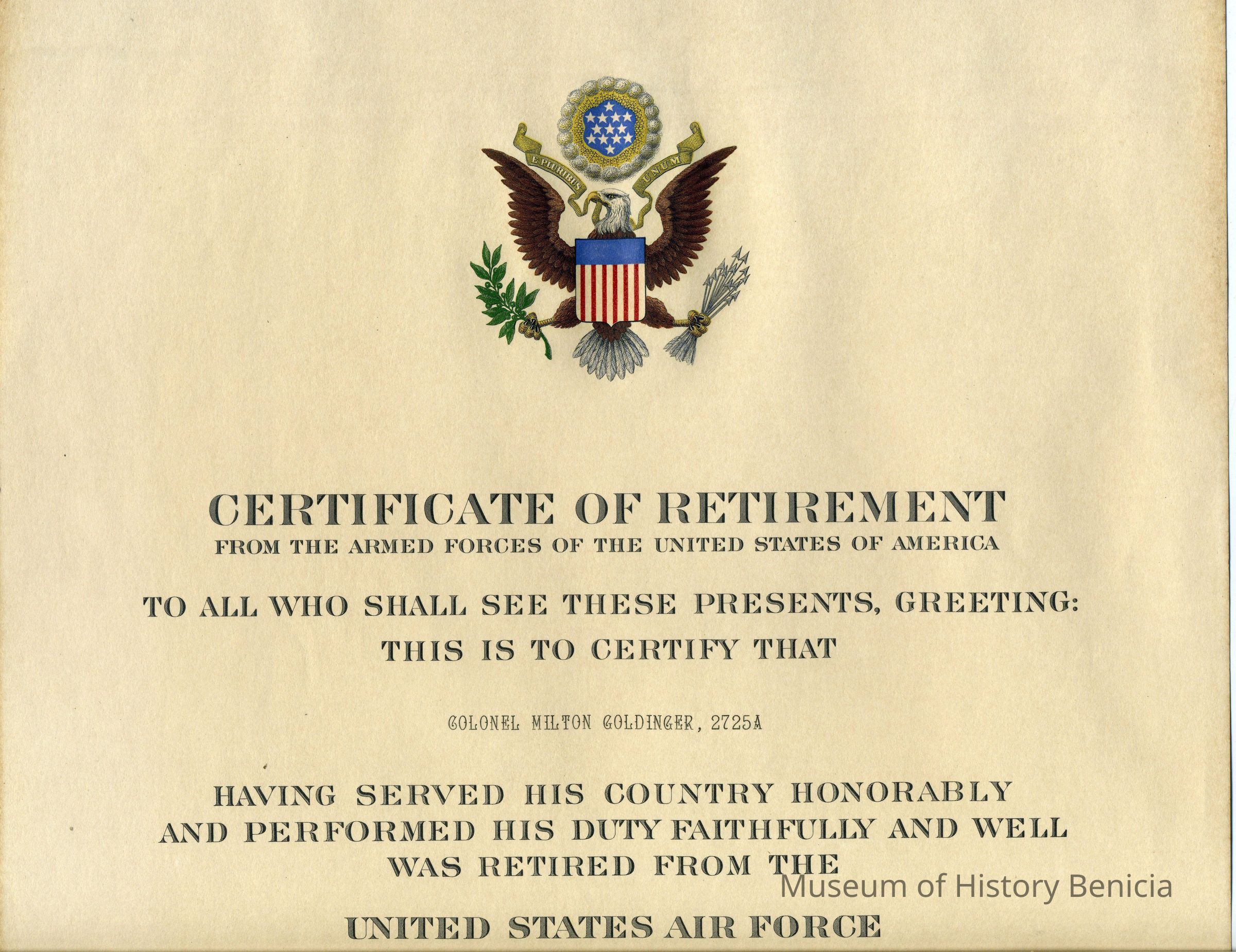 Certificate of of Retirement for the Air Force for Honorable service presented to Colornel Milton Goldinger, 2725A signed by the Major General, USAF, Commander, Western Transport Air ForceCollection