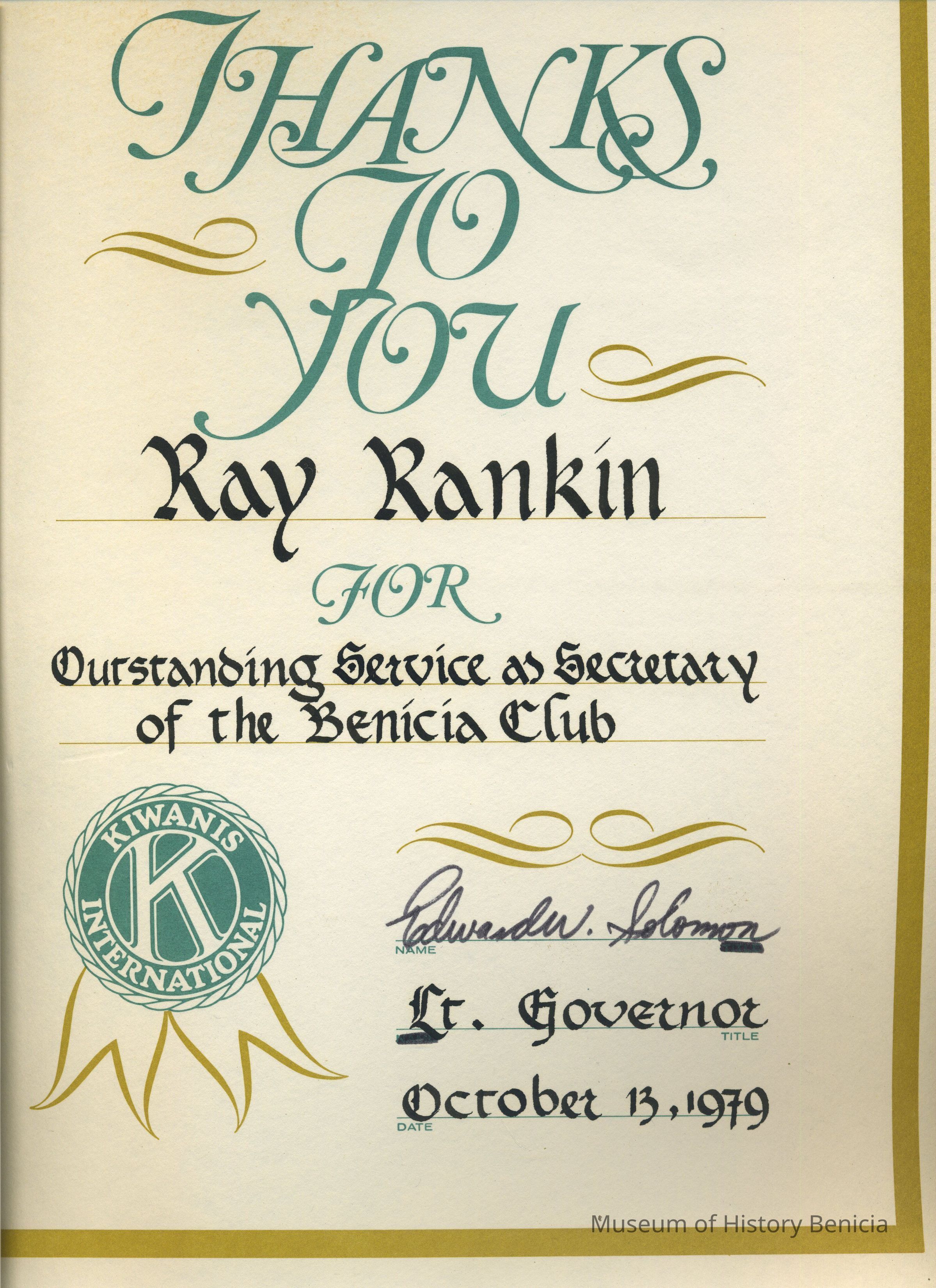 Certificate - Thank you from the Kiwanis International to Ray Rankin for "Outstanding Service as Secretary of the Benicia Club", signed by Edward W. Solomon, Lt. Governor,
