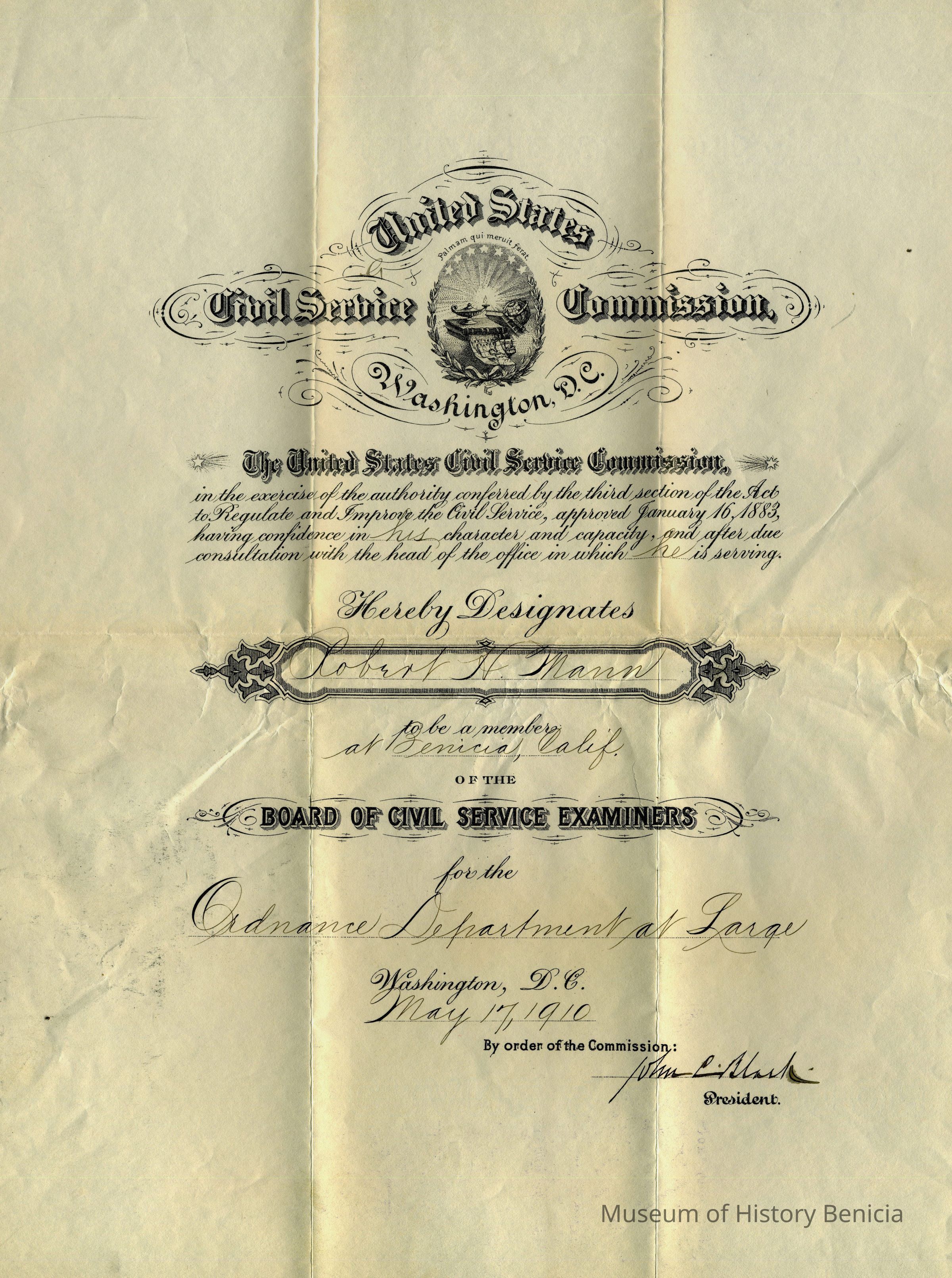 "Herely Designates Robert H. Mann to be a member at Benicia, Calif. of the Board of Civil Service Examiners for the Ordinance Department at Large"