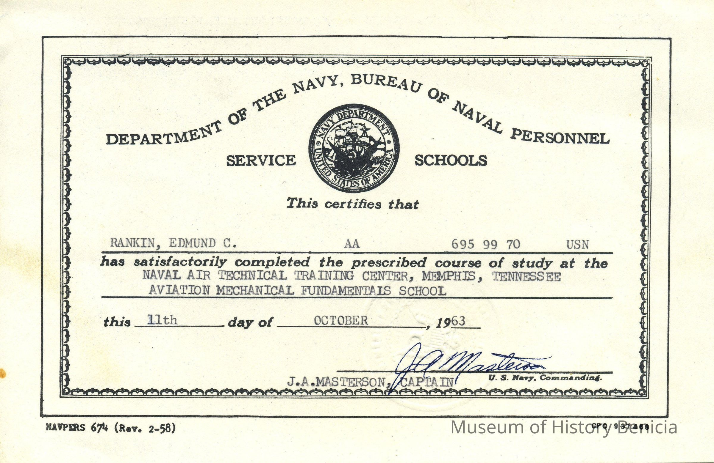 Certificate from Department of the Navy, Bureau of Naval Personnel: Service Schools certifying that Edmund C. Rankin has satisfactorily completed the prescribed course of study at the Naval Air Technical Training Center, Memphis, Tennessee, Aviation Mechanical Fundamental School on the 11th day of October 1963 and signed by J.A. Masterson, Captain U.S. Navy, Commanding.