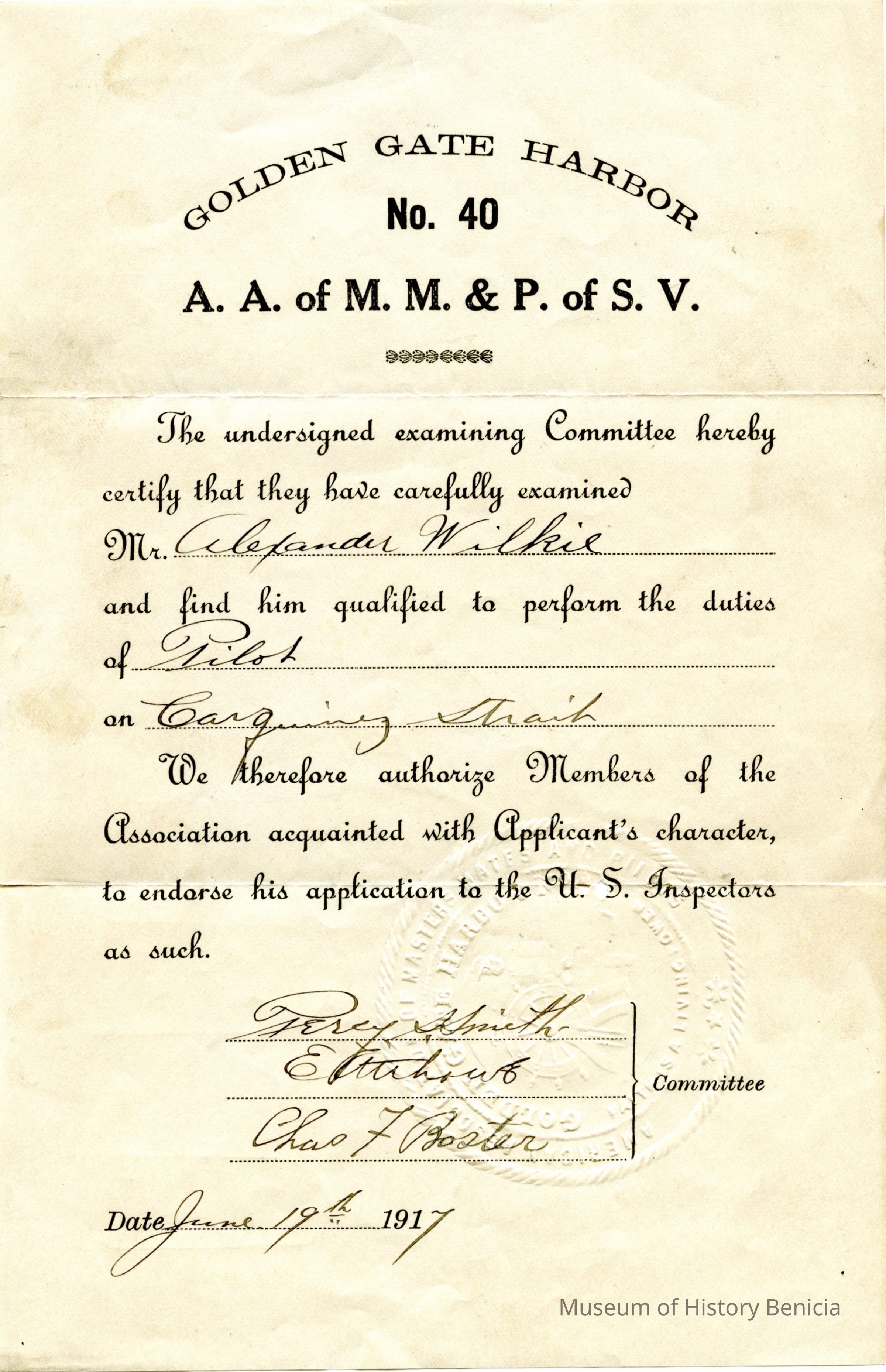 This is a certificate showing that Alexander Wilkie is qualified to perform the duties of pilot on the Carquinez Straits. It is from the Golden Gate Harbpor No. 40 of the A.A. of M.M. & P. of S. V.