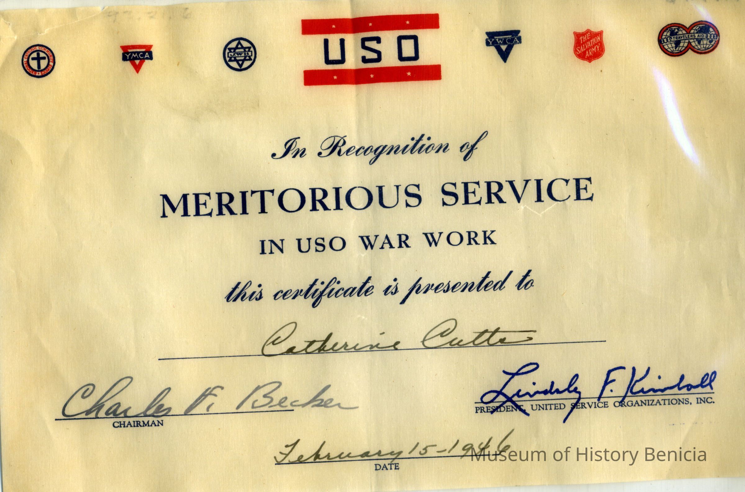 United Service Organization, In recognition of meritorious service in USO War Work this certificate is presented to Mrs. Catherine Cutts, signed Charles A. Baker, Chairman, USO CouncilCollection