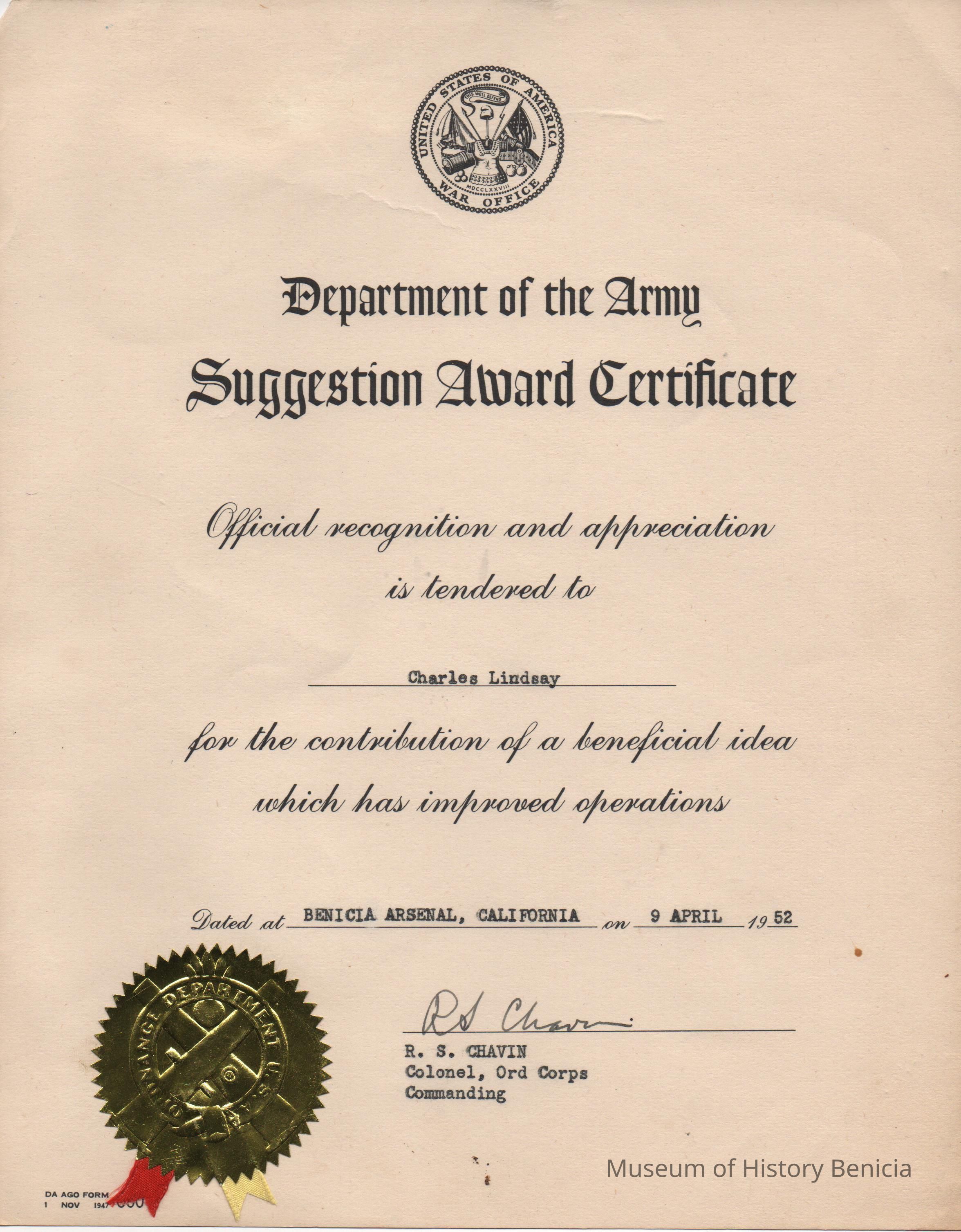 Department of the Army-Suggestion Award Certificate