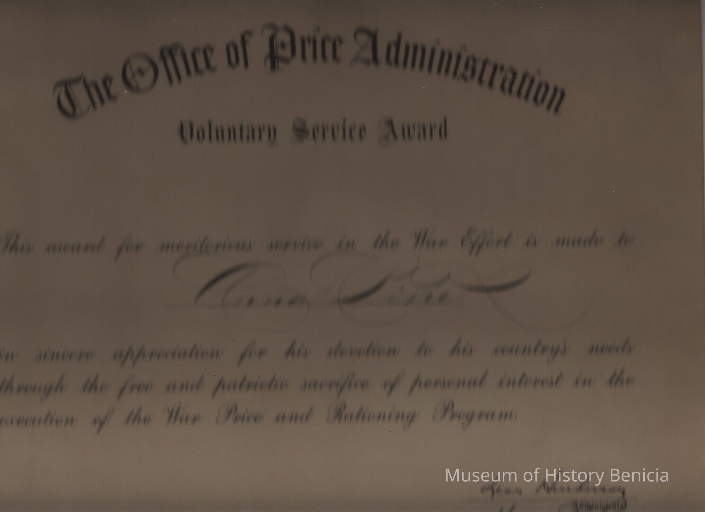 Tan paper with black printing "Office of Price Administration/voluntary Service Award...Anna Pine...1942" It was given for meritorious service in the War Effort...it also indicates appreciation for "his" devotion to "his" cuntry's needs....War Price and Rationing Program.