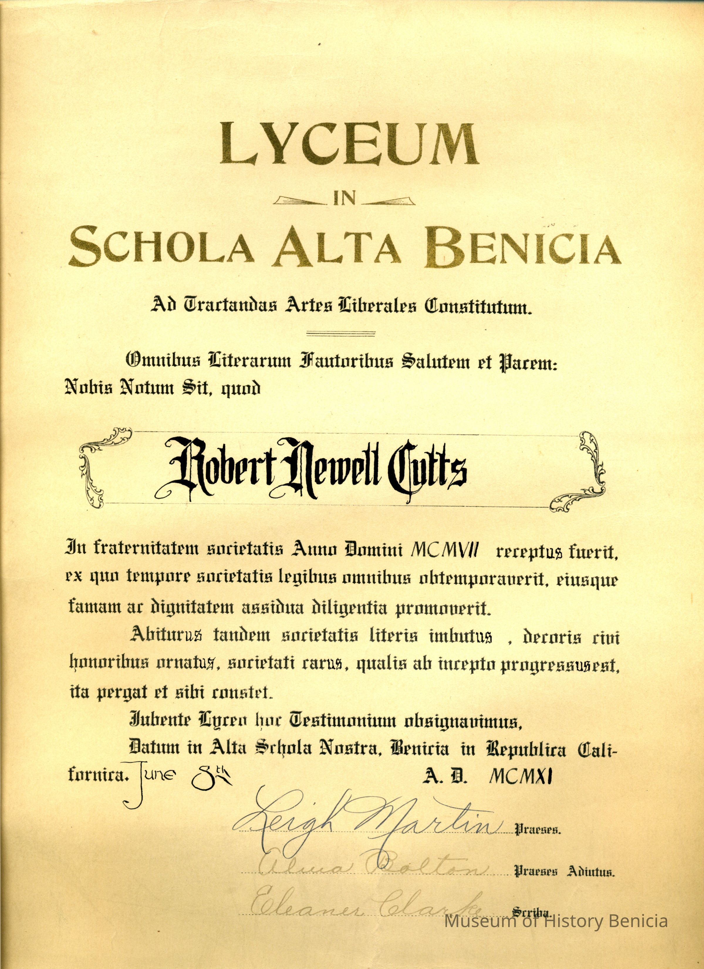 Lyceum in Schola Alta Benicia, Ad Trartan das Artes Liberales Constitutum, Omnibus Literanum ? autoribus Salutem et Darem Nobis Sit, grad. ROBERT NEWELL CUTTS June 8th MCMXI (1911)Collection
