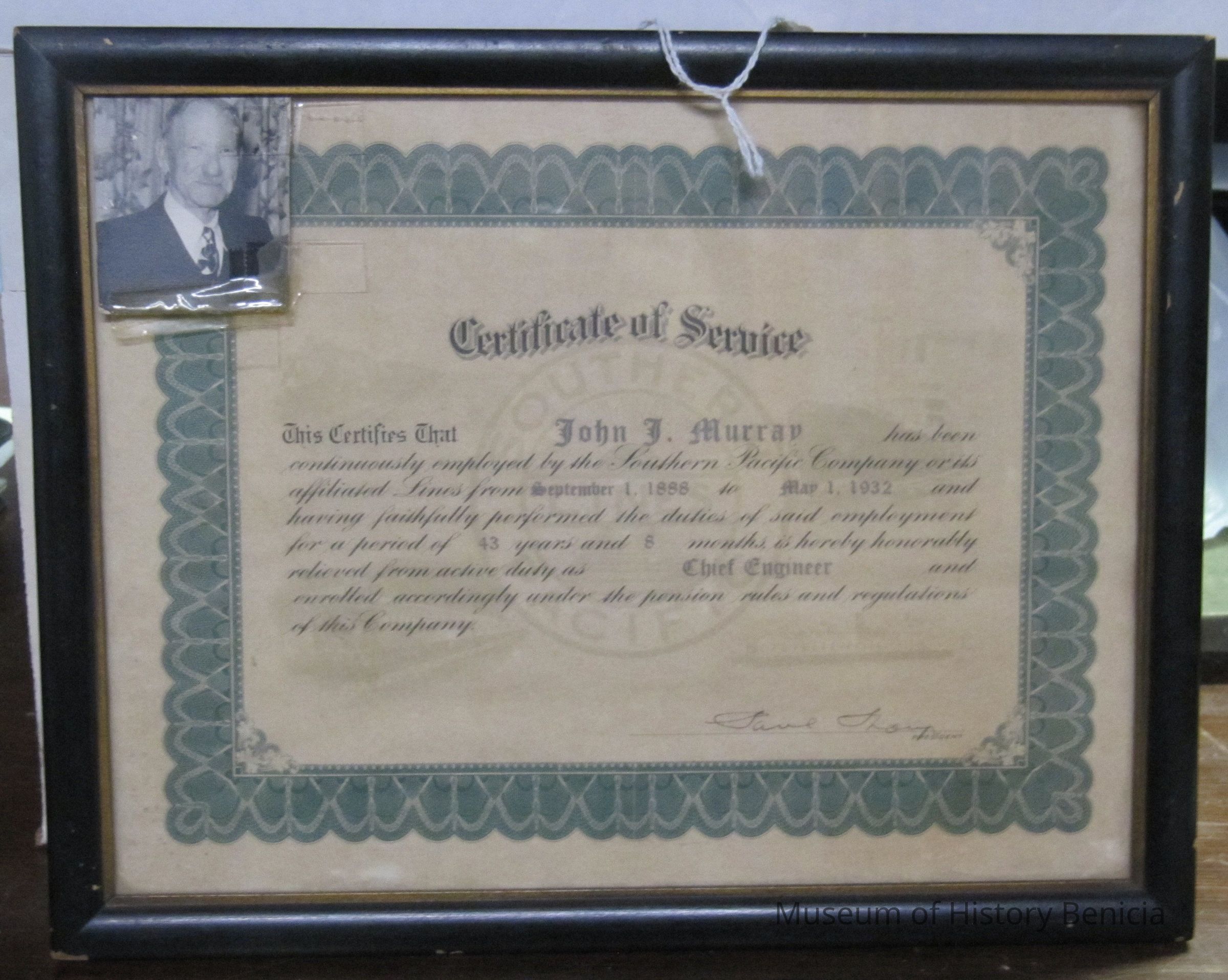 This is a framed certificate of appreaciation for John Murray's work as Chief Engineer for 43 years on the Southern Pacific.Collection