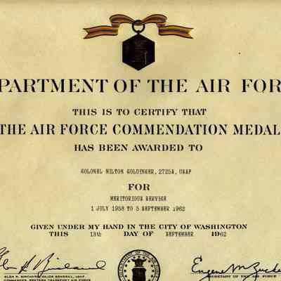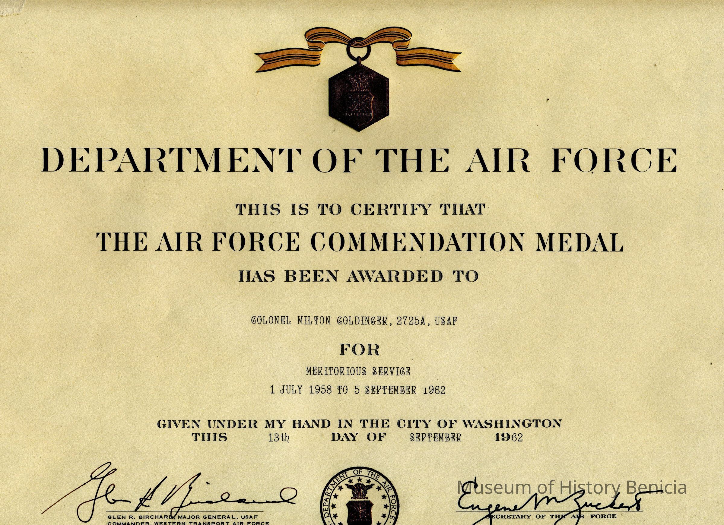 Certificate from the Department of the Air Force for a Commendation Medal Awarded to Colonel Milton Goldinger for Meritorious Service. Received in Glass FrameCollection