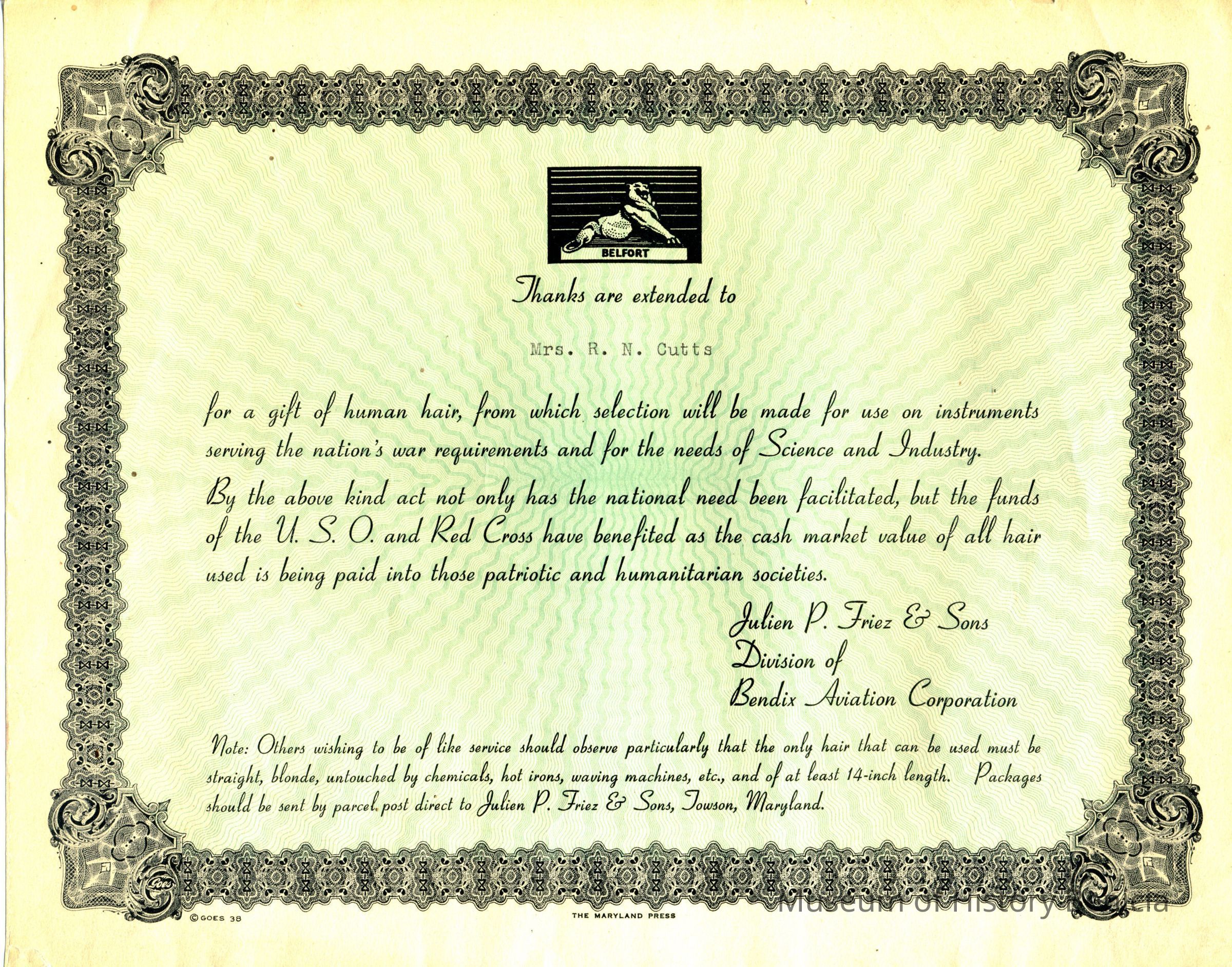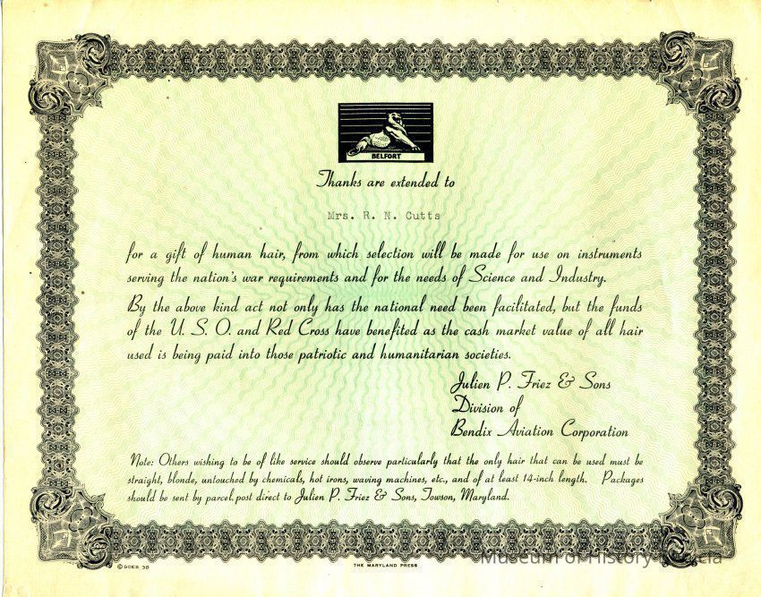 Certificate stating that a hair donation by Mrs. R N Cutts will be used on instruments serving the nations war requirements and for the needs of science industry.Collection