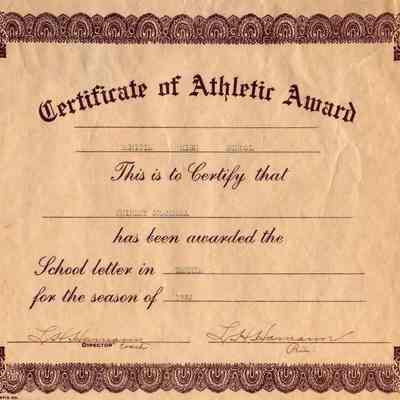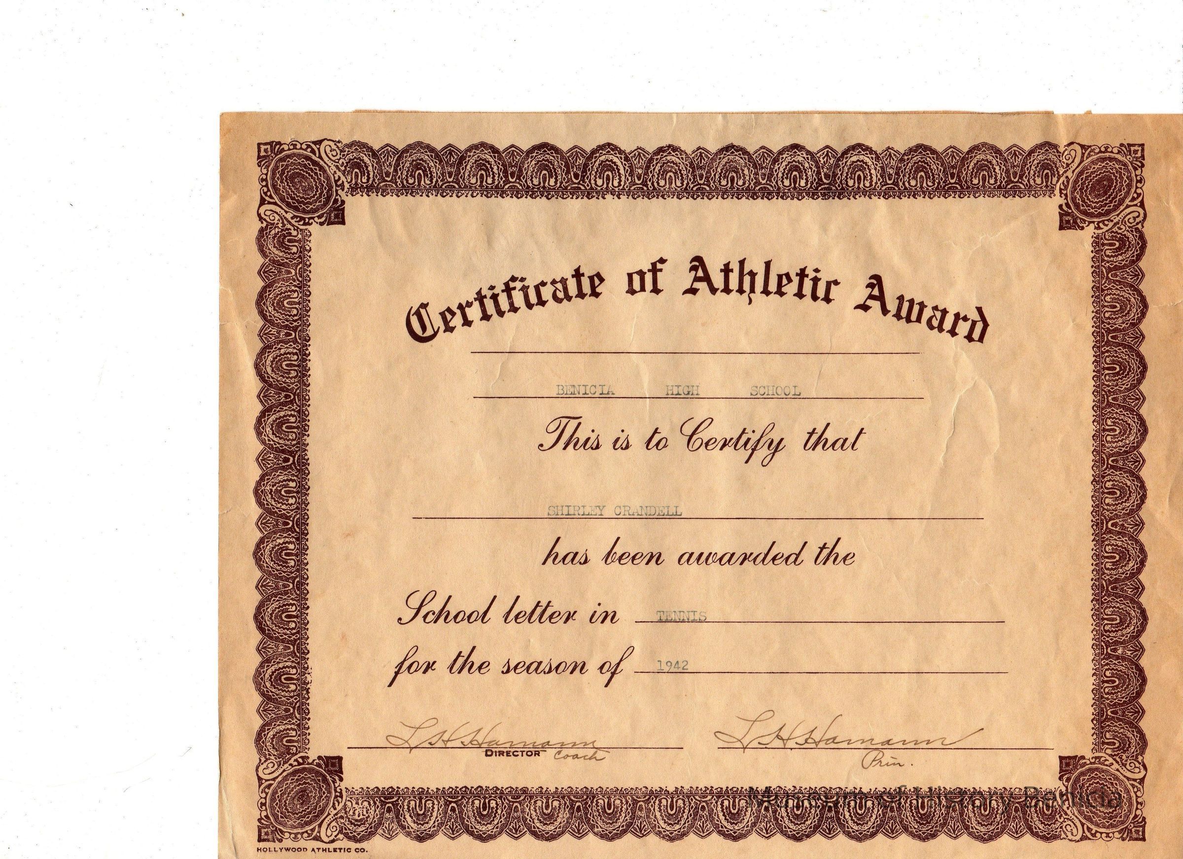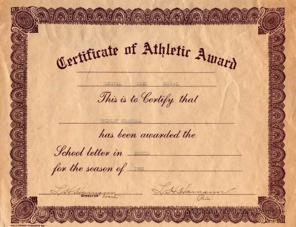 Athletic Award 1942 -- Shirley Crandell -- Tennis. It is signed twice by L.H. Hamann as principal and as coach