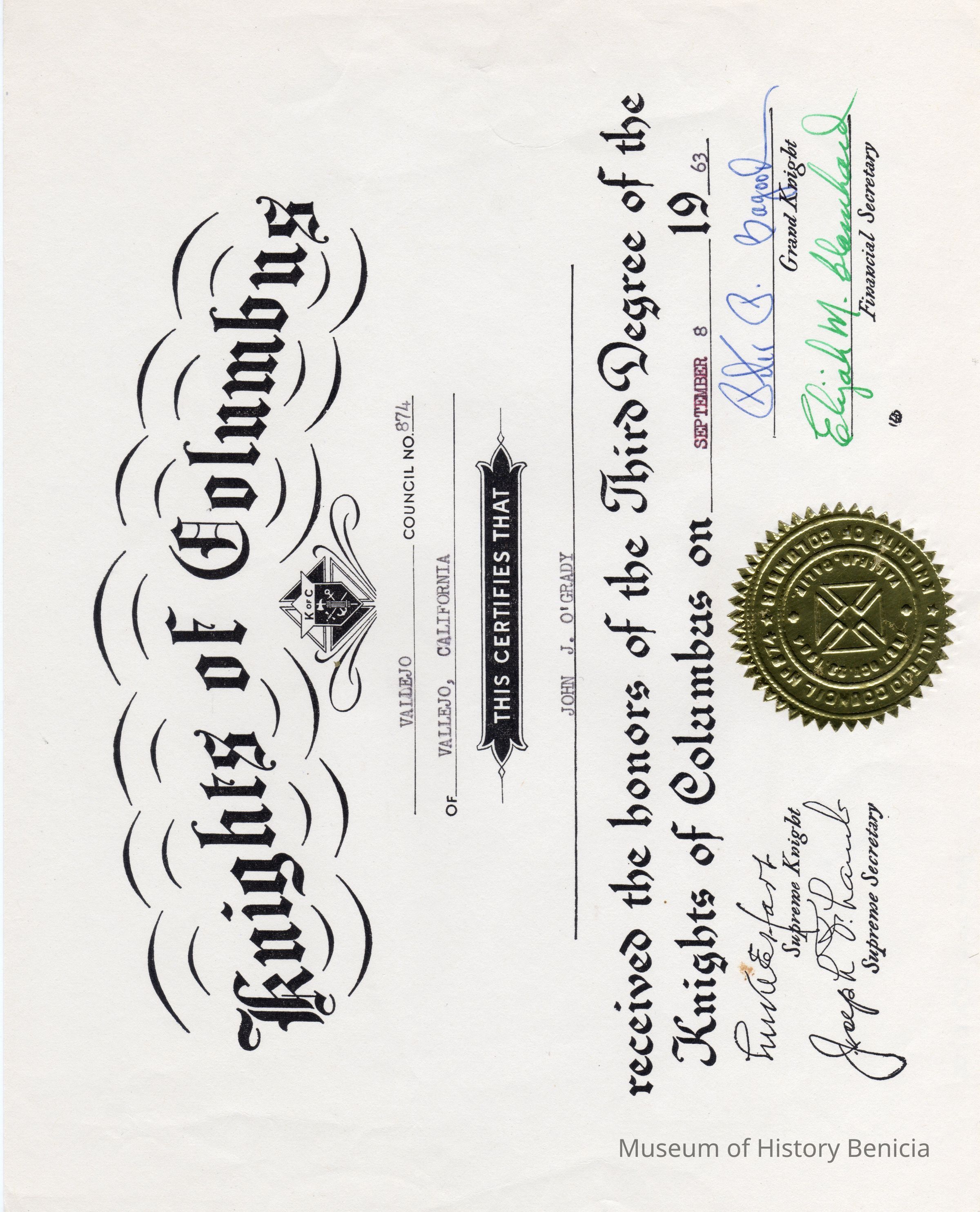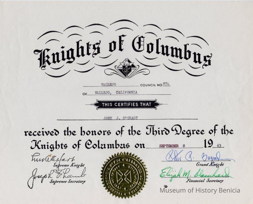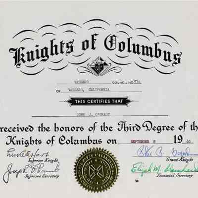 Knights of Columbus certificate for John J O'Grady receiving the third degree on 09/08/1963.