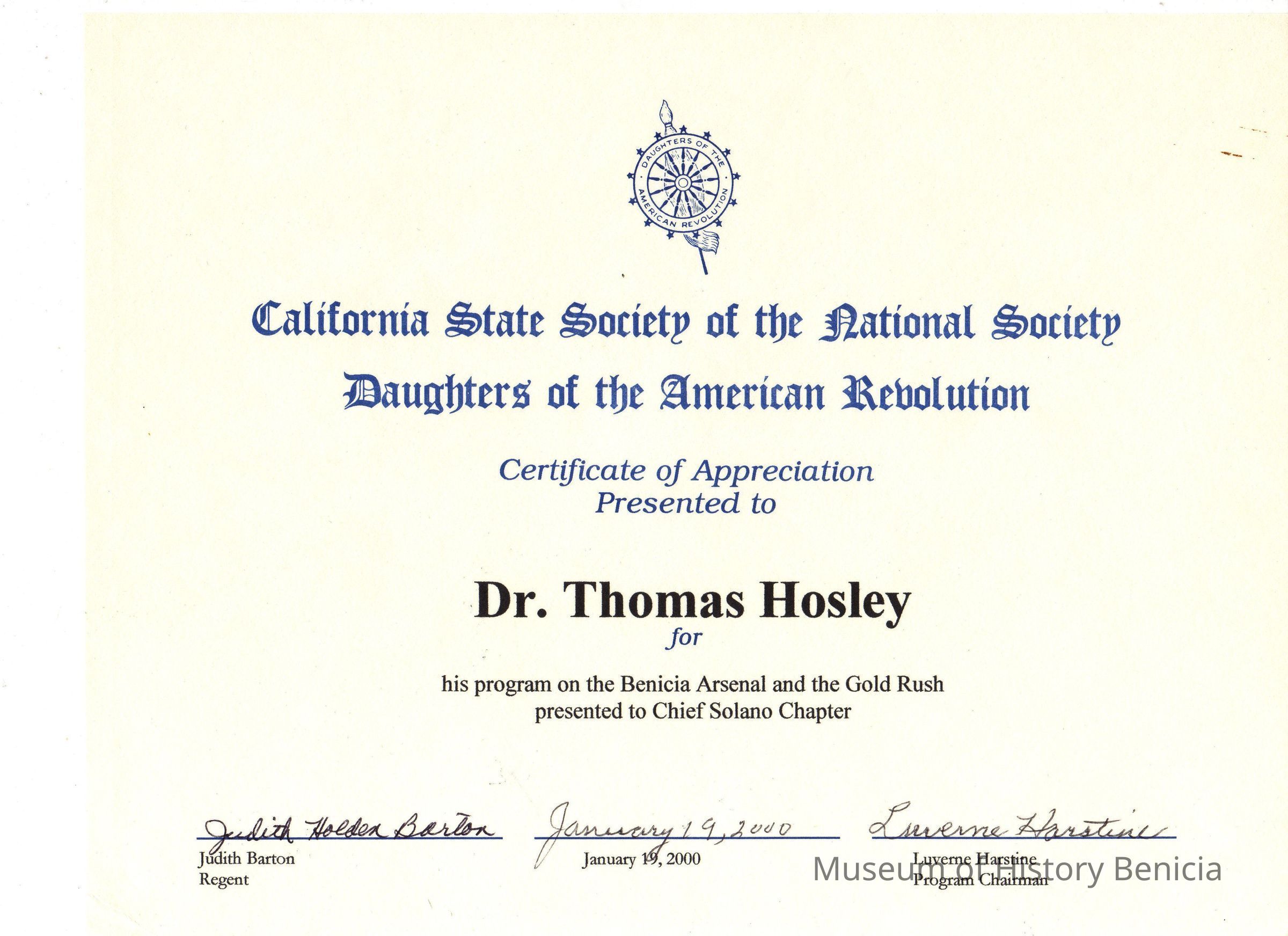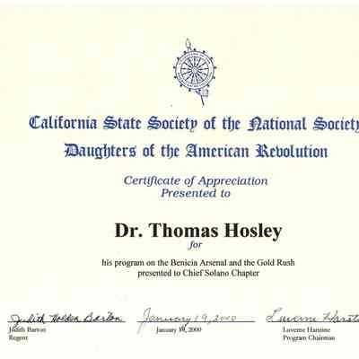 Certificate of Appreciation presented to Dr. Thomas Hosley for his program on the Benicia Arsenal and the Gold Rush from California Society of the National Society of the Daughters of the American Revolution [D.A.R.] presented on January 19, 2000 and signed by Judith Barton, Regent and Luverne Harstine, Program Chairman.