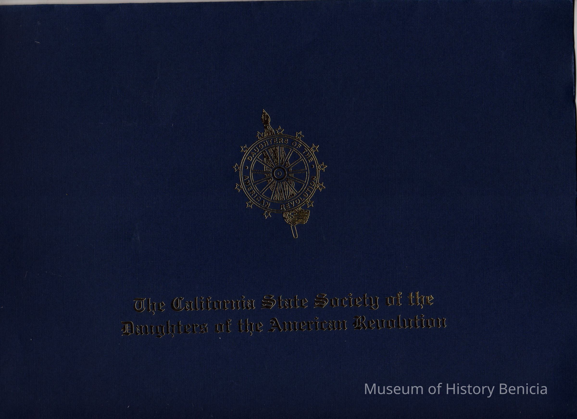 Kept in a blue construction paper-weight folder [BHM2011.032.0001a] with the logo of D.A.R. and "The California State Society of the Daughters of the American Revolution" in gold on the cover.Collection