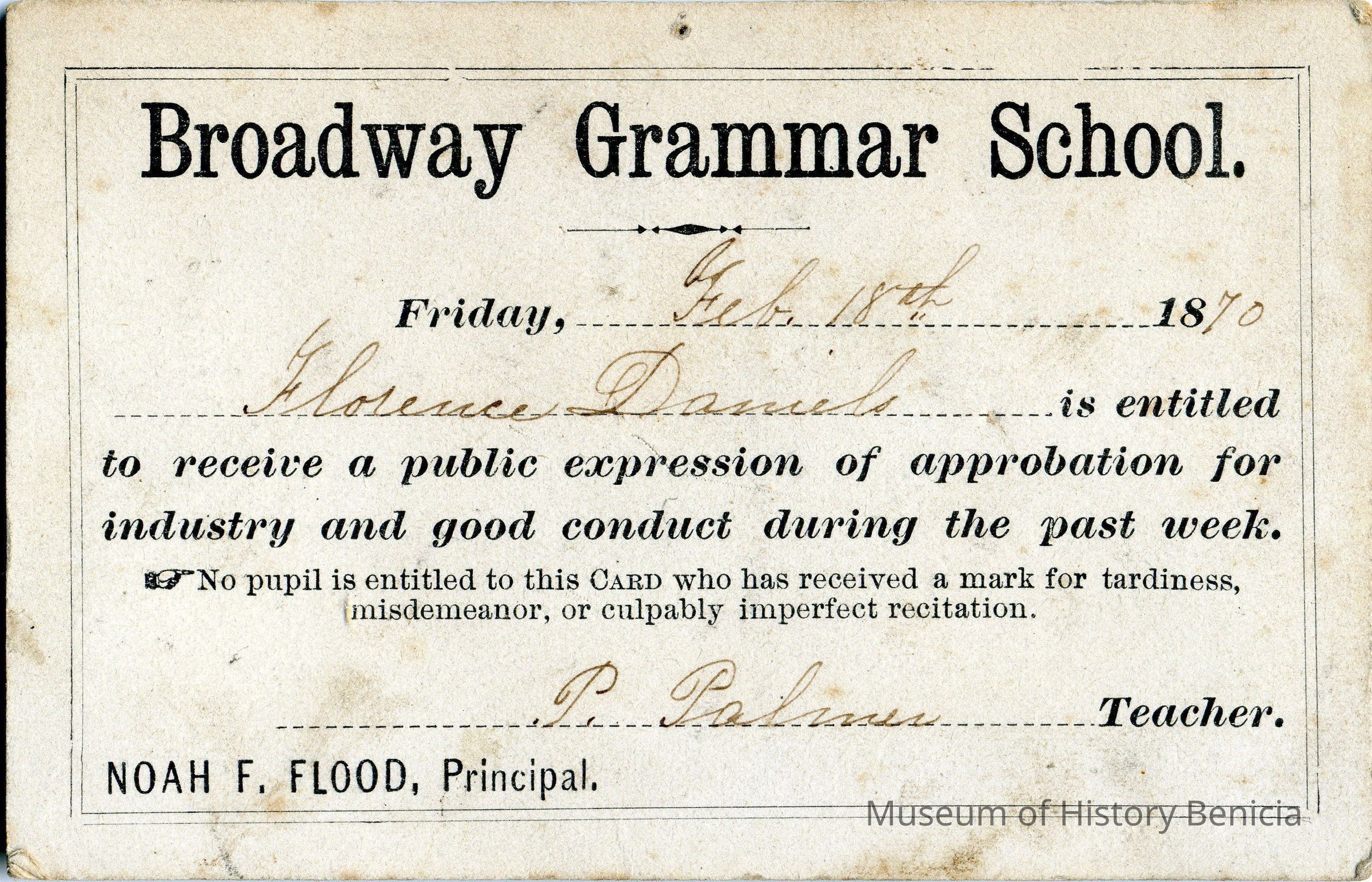 A card issued to Florence Daniels in 02/17/1870 for good conduct during the prior few weeks. The teacher is T. PalmerCollection