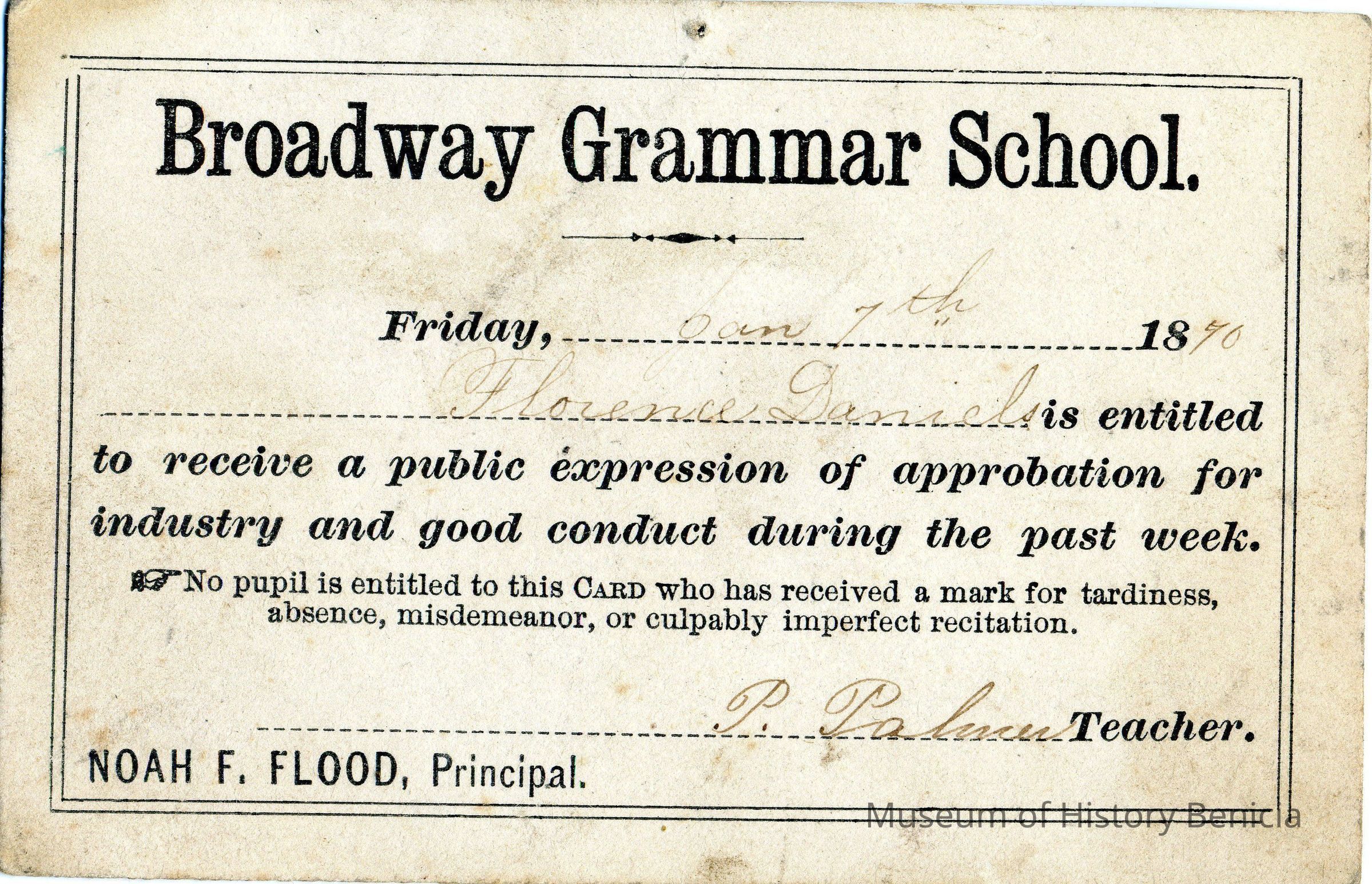 A card issued to Florence Daniels in 01/07/1870 for good conduct during the prior few weeks. The teacher is T. PalmerCollection