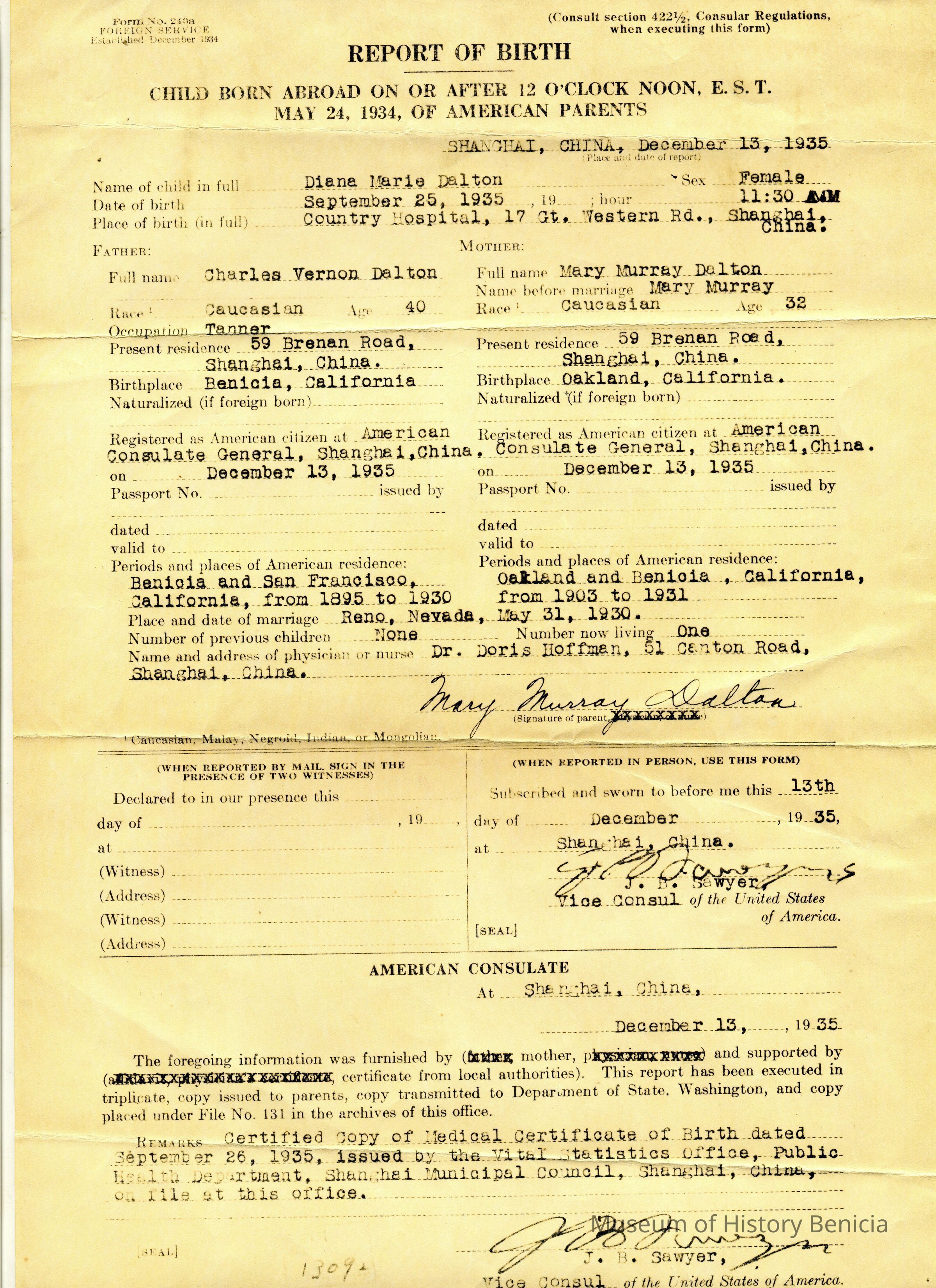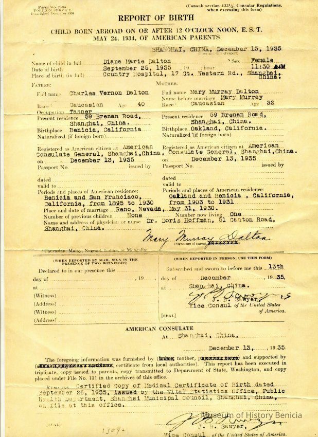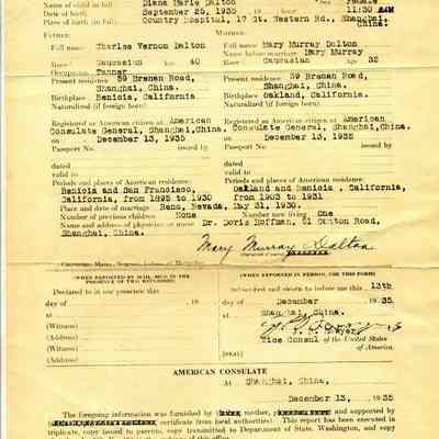 Diane Marie Dalton, Sept. 25, 1935 at 11:30am, County Hospital, 17 Gt. Western Rd., Shanghai, China. Father: Charles Vernon Dalton (59 Brenan Rd. Shanghai, China) Mother: Mary Murray Dalton (59 Brenan Rd. Shanghai, China) Certificate signed by J.B. Sawyer, Vice Consol of the U.S.Collection