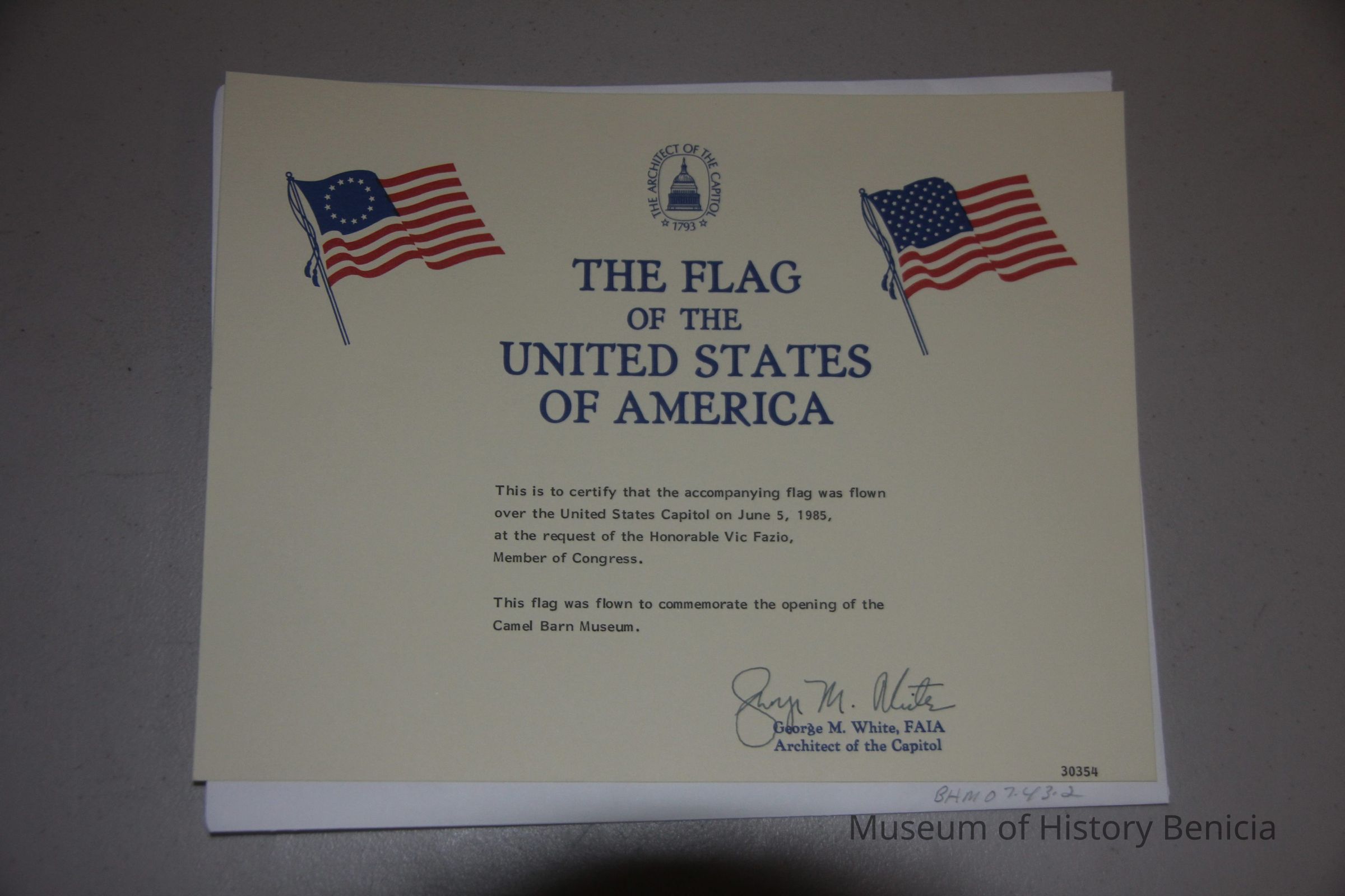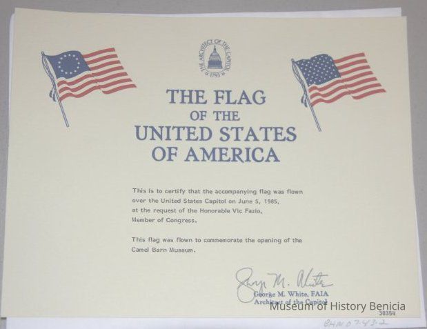 "The Flag of the United State of America" certificate signed by George M. White, architect of the capitol.