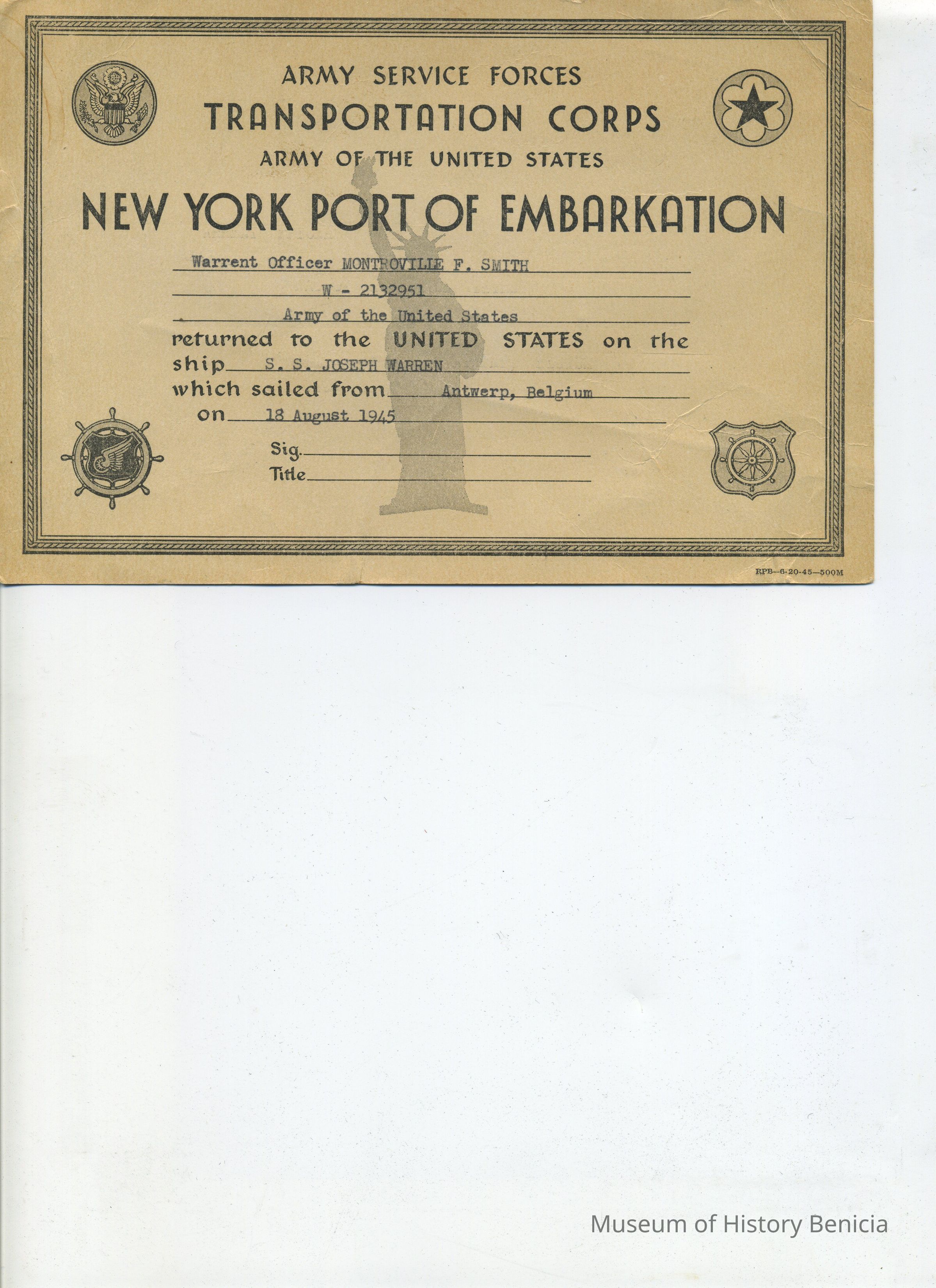 Army Services Force / Transportation Corps / Army of the United States / New York Port of Embarkation