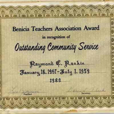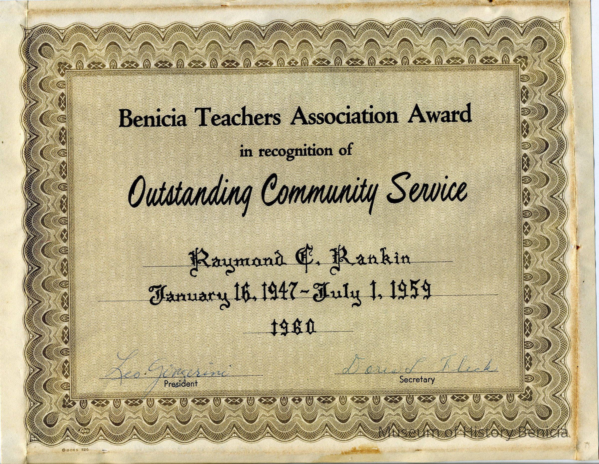 Certificate of recognition for Outstanding Community Service given to Raymond C Rankin in 1960 for service from 01/16/1947 to 07/01/1959.Collection