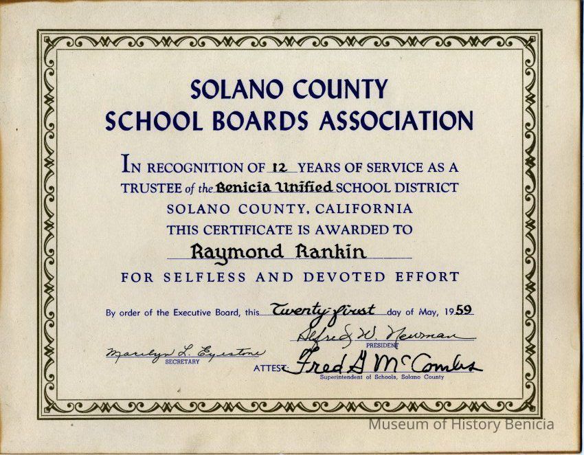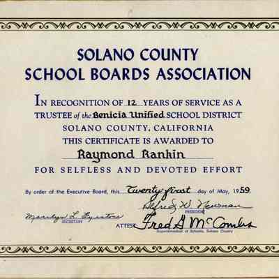 Certificate of recognition for 12 years of service as a Solano County School Board trustee. Given to Raymond Rankin on 05/21/1959.Collection