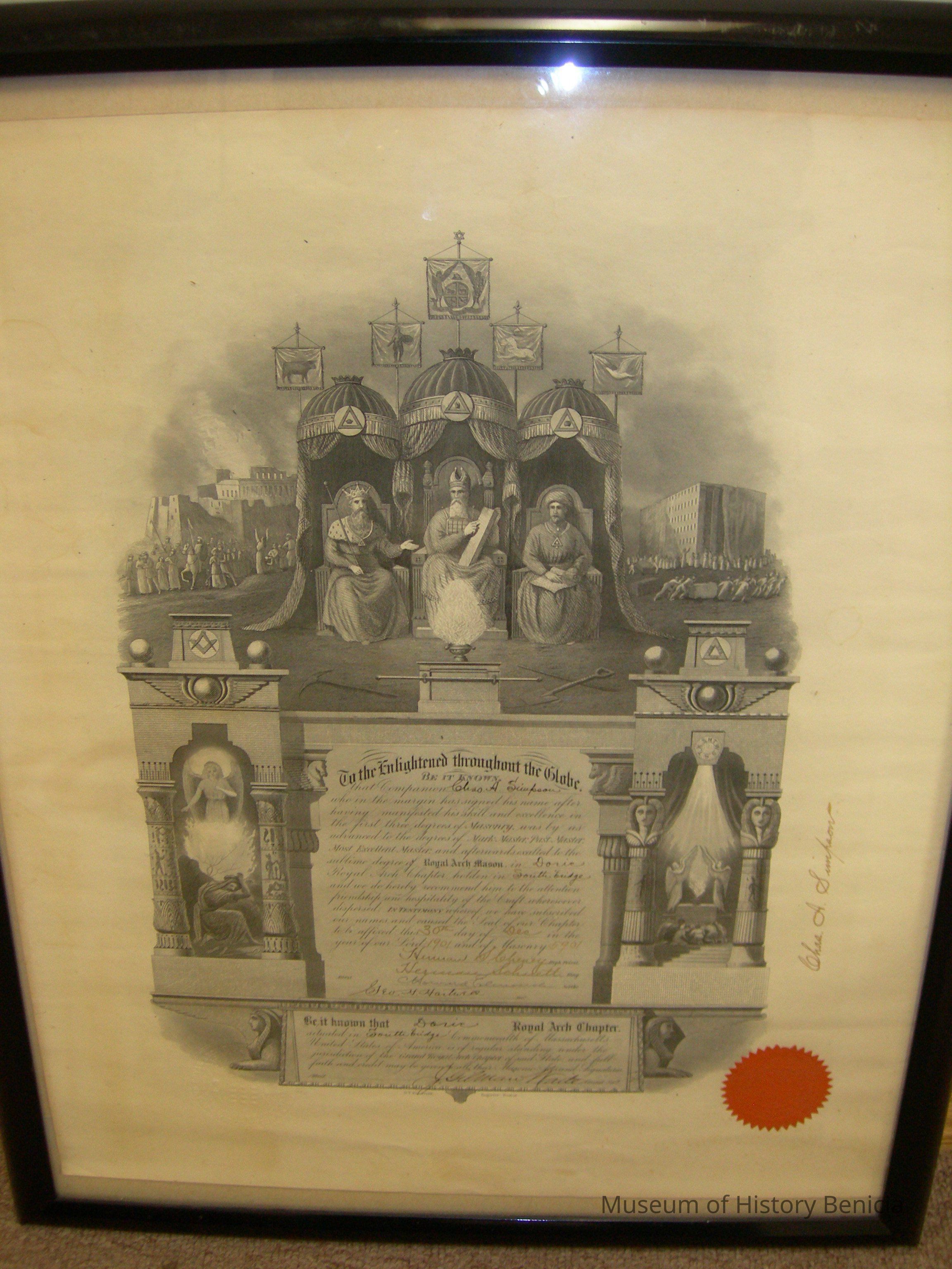 black w/glass 17" x 21" framed certificate - advanced degree of Royal Arch Mason for Charles A. Simpson Sr. dated December 30, 1901