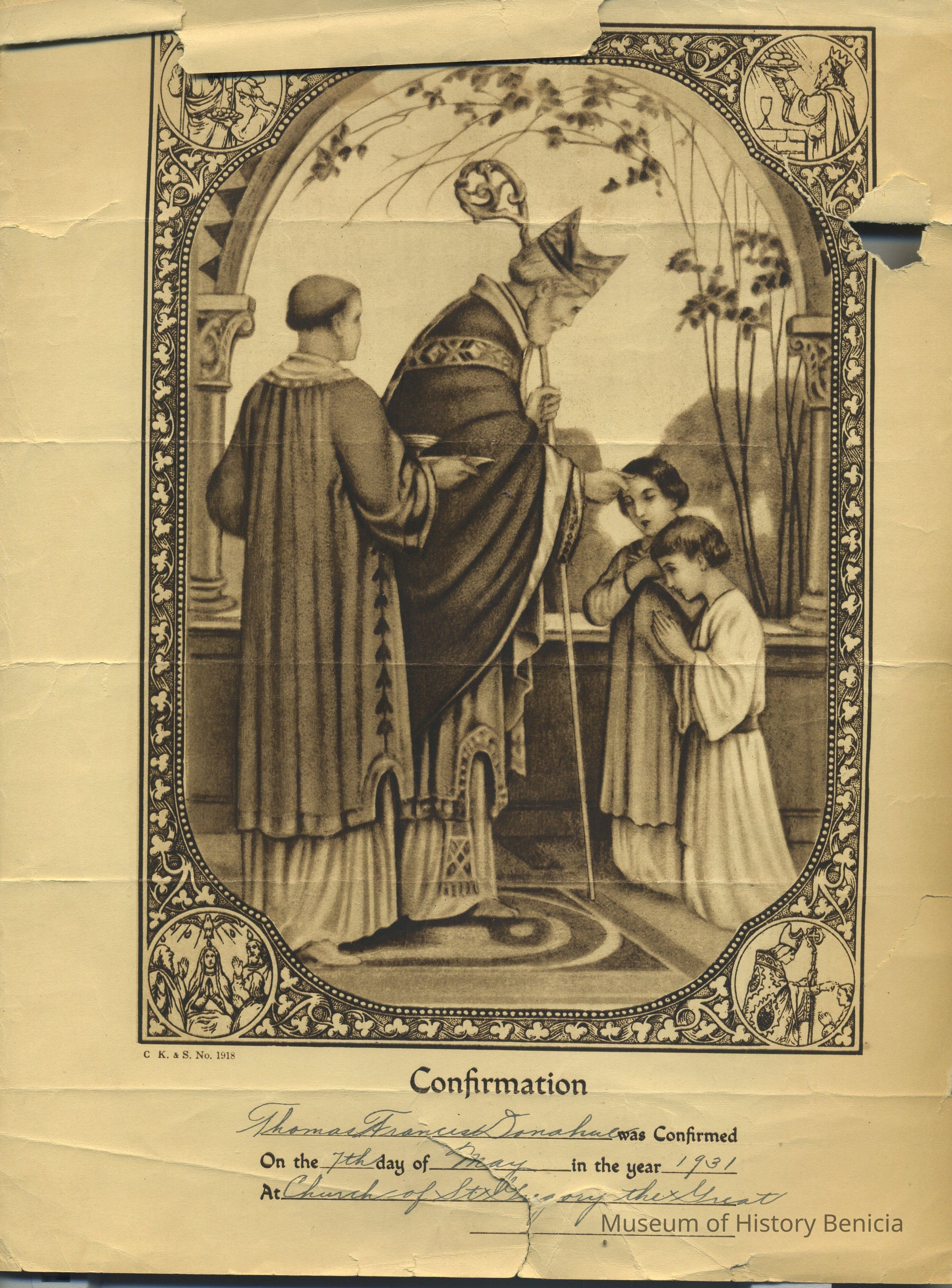 Confirmation Certificate - Thomas Francis Donohue confirmed on 7th day of May 1931, Church of St. Gregory the Great, has sepia colored lithograph of the Confirmation Ceremony; some wear and torn corners, 9" x 12"Collection