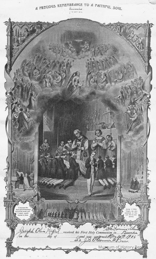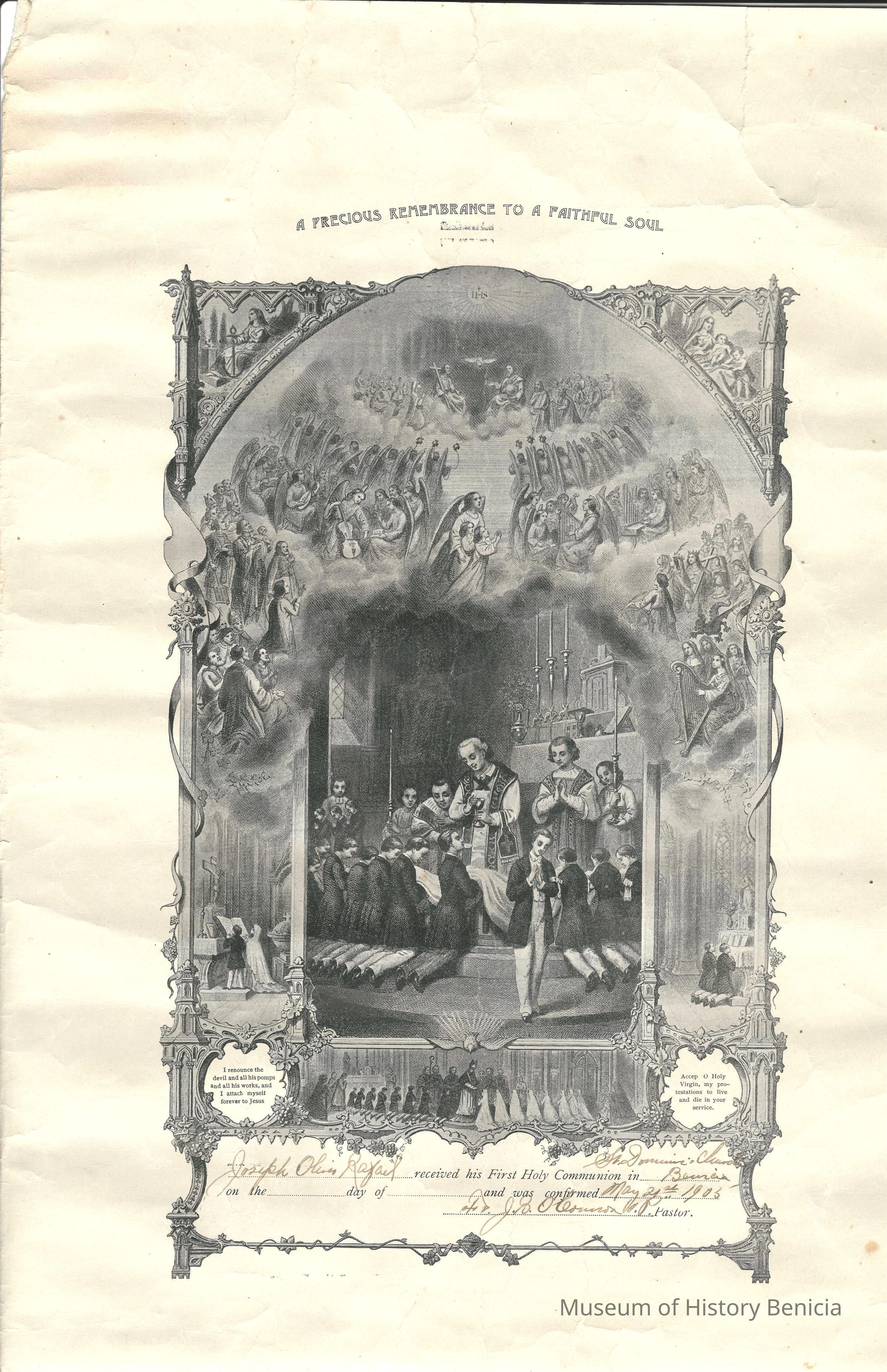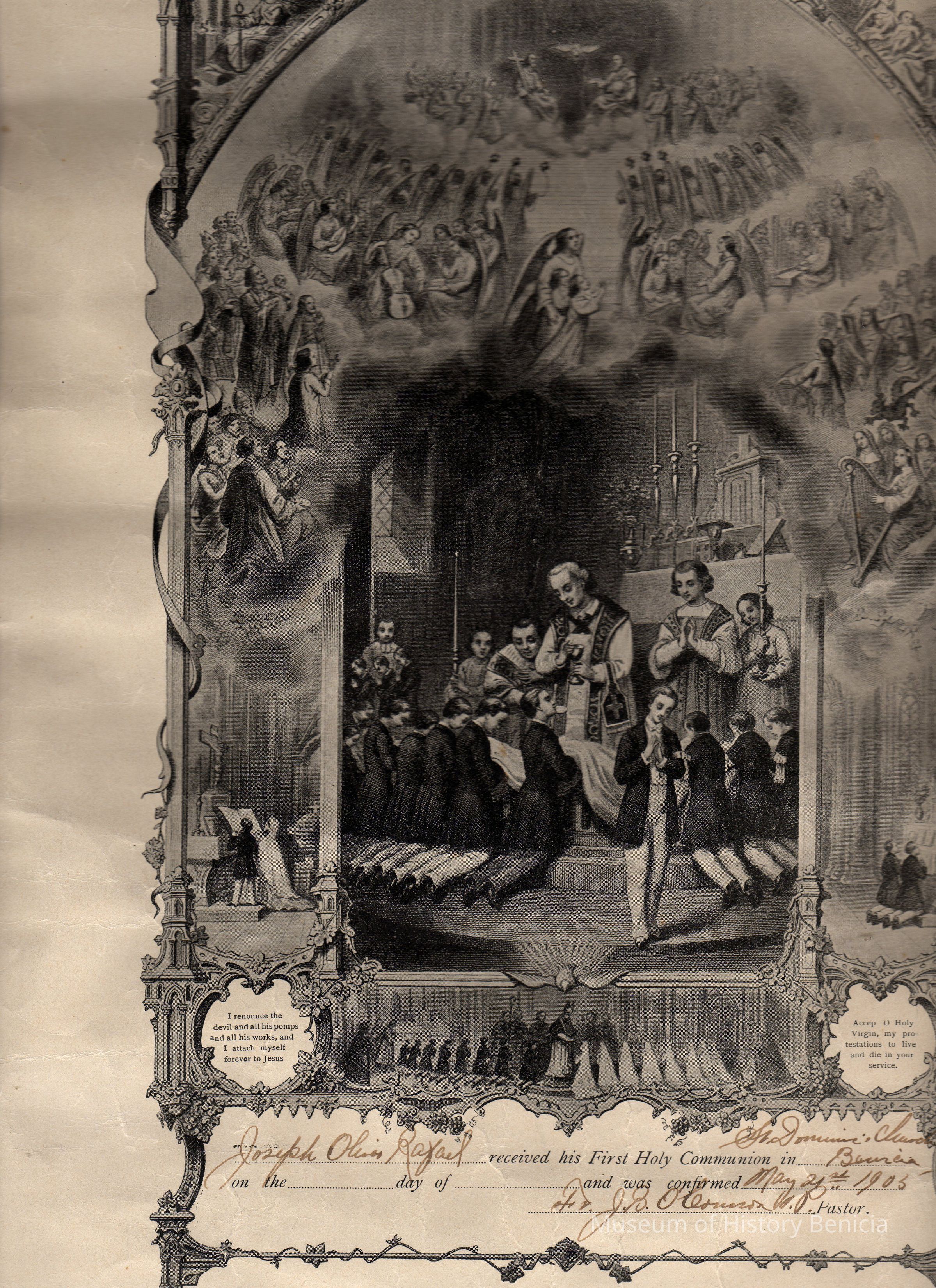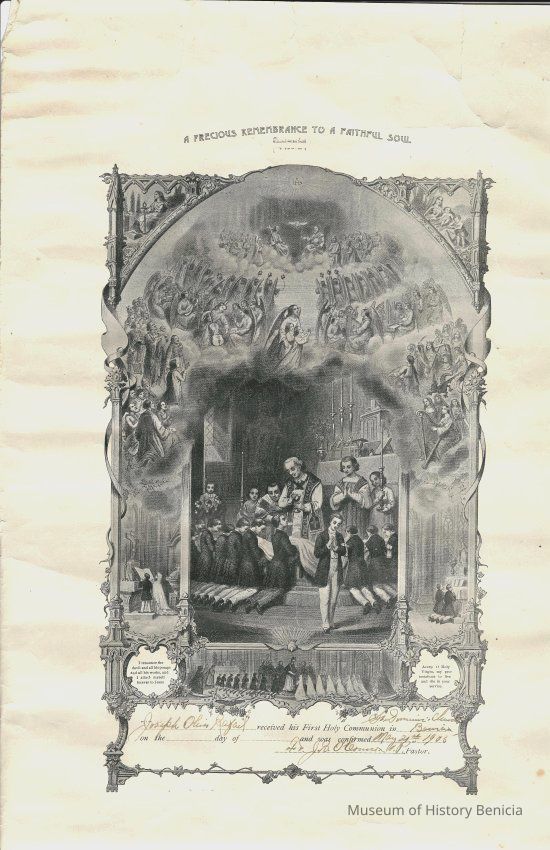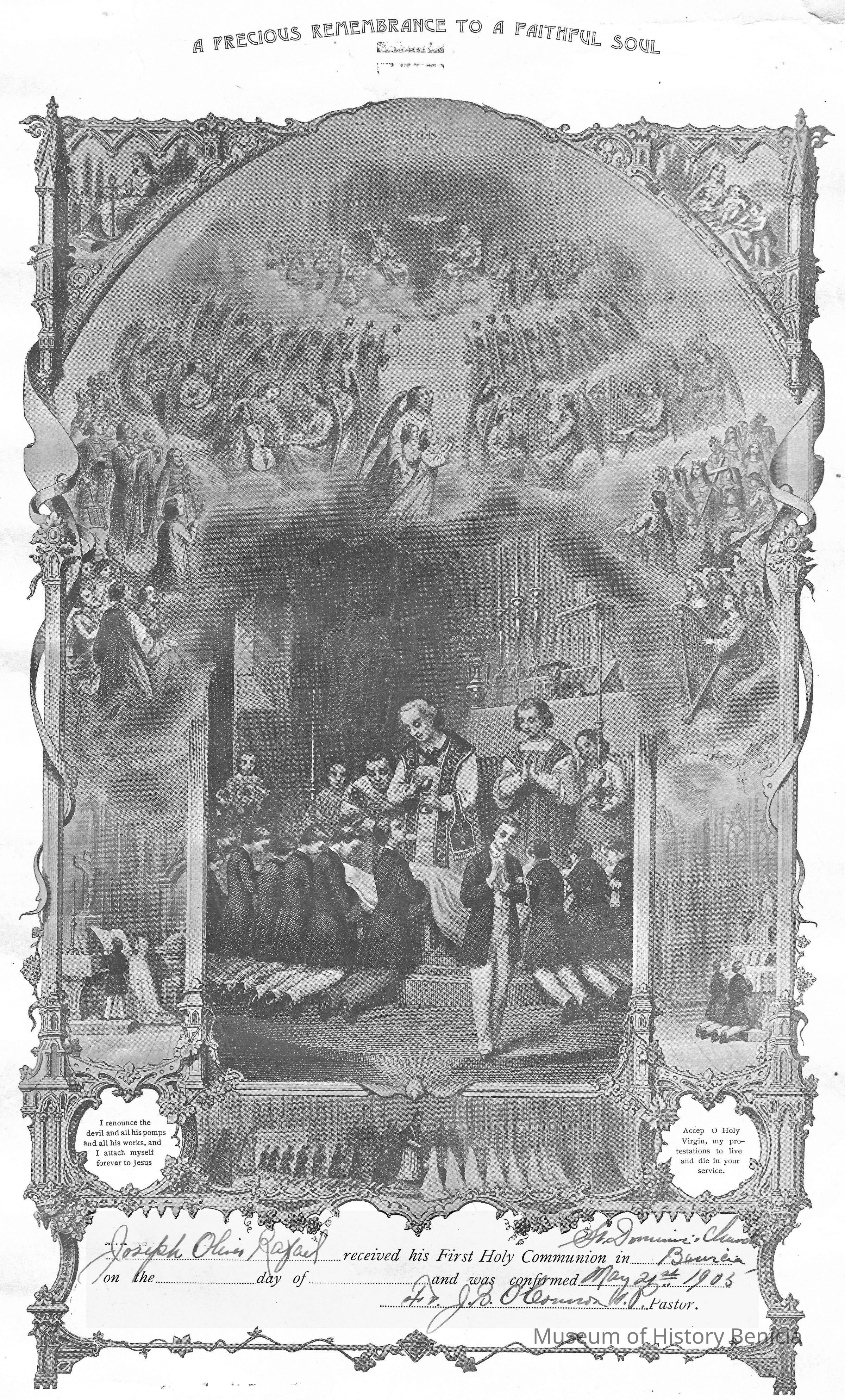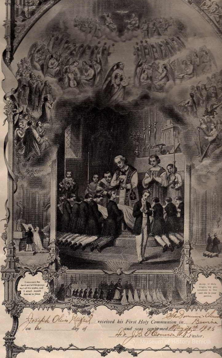 Joseph Oliver Rafael received his First Holy Communion in Benicia (St Dominic's Church) no date, and was confirmed May 21st, 1905
