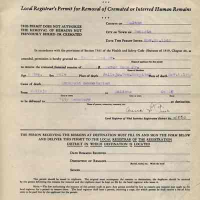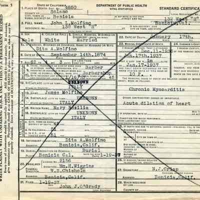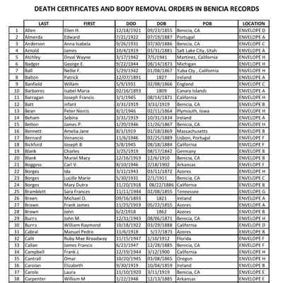 This is a collection of Death Certificates and Orders for Removal collected by Mike Hayes. The individual certificates have been cataloged into a spreadsheet (see below). The index shows last name, first name, date of death, date of birth, and place of birth. The actual certificates are in envelopes of about 50 certificates each for easier retrieval.