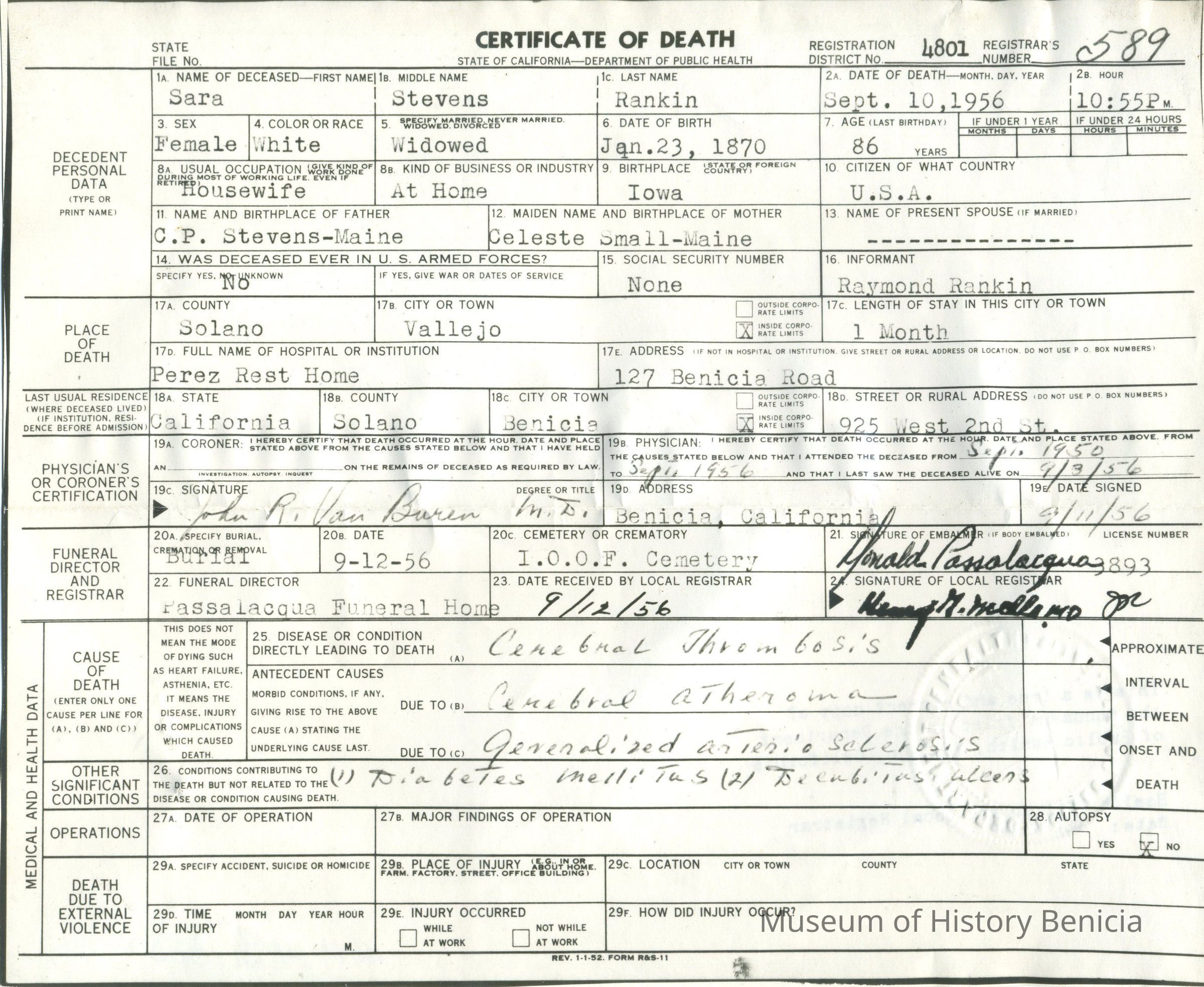 Certificate of Death for Sara Stevens Rankin Born: January 23, 1870 Died: September 10, 1956 [From the Rankin Collection]