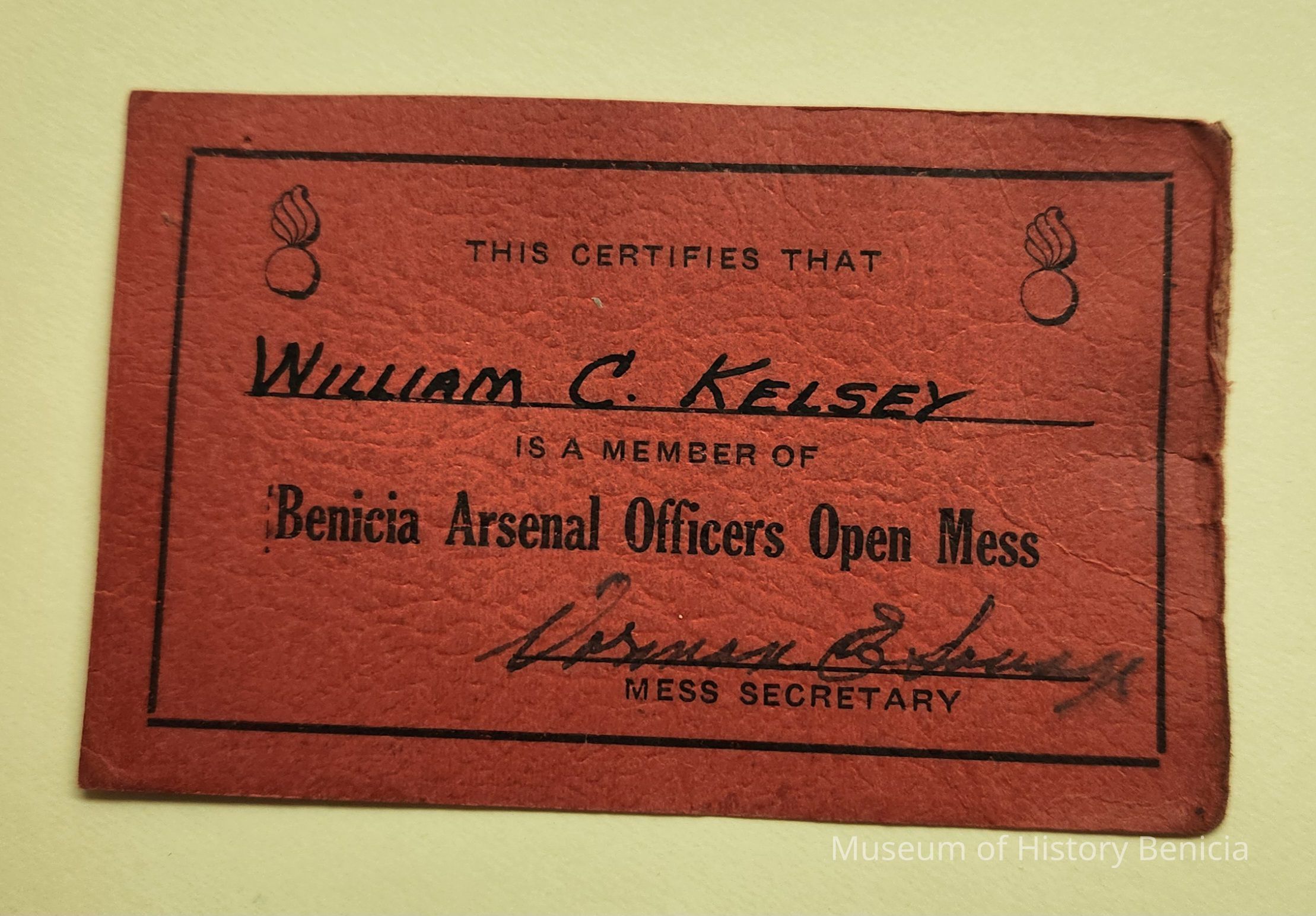 Red rectangular card with black printing: "This certifies that / William C. Kelsey / is a Member of / Benicia Arsenal Officer's Open Mess / (signature Vernon Savage) / Mess Secretary; there is an ordnance symbol in each upper cornersCollection