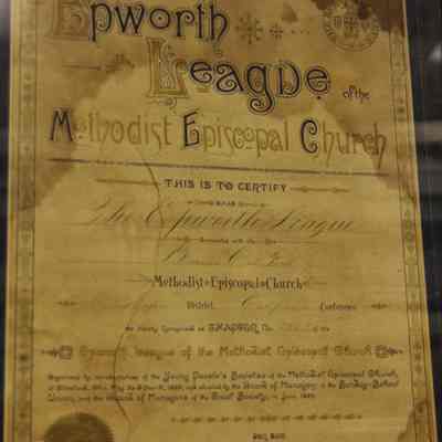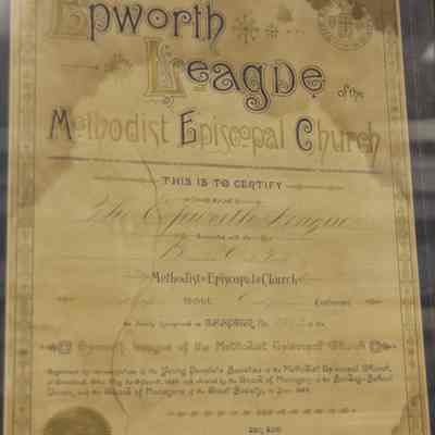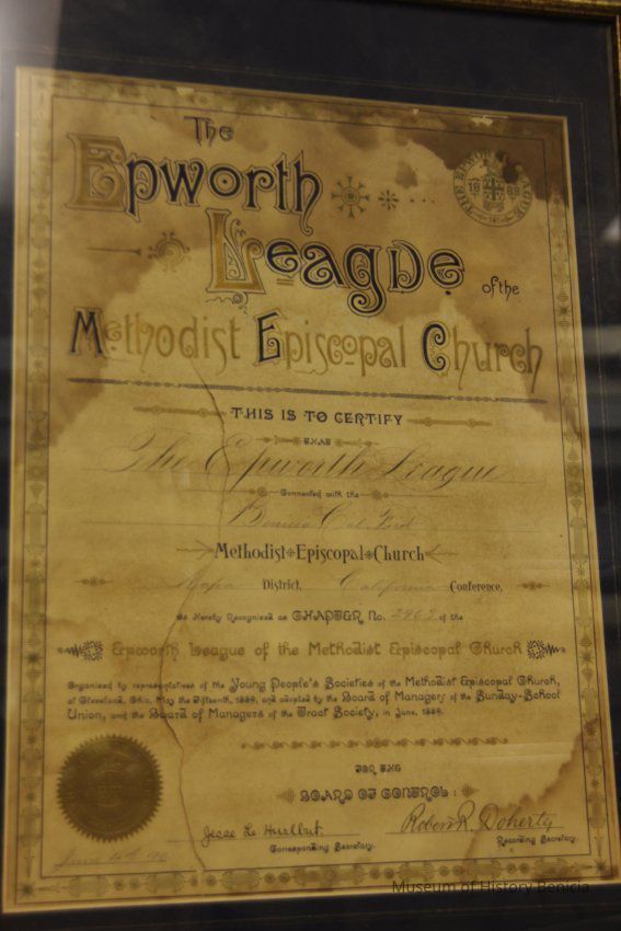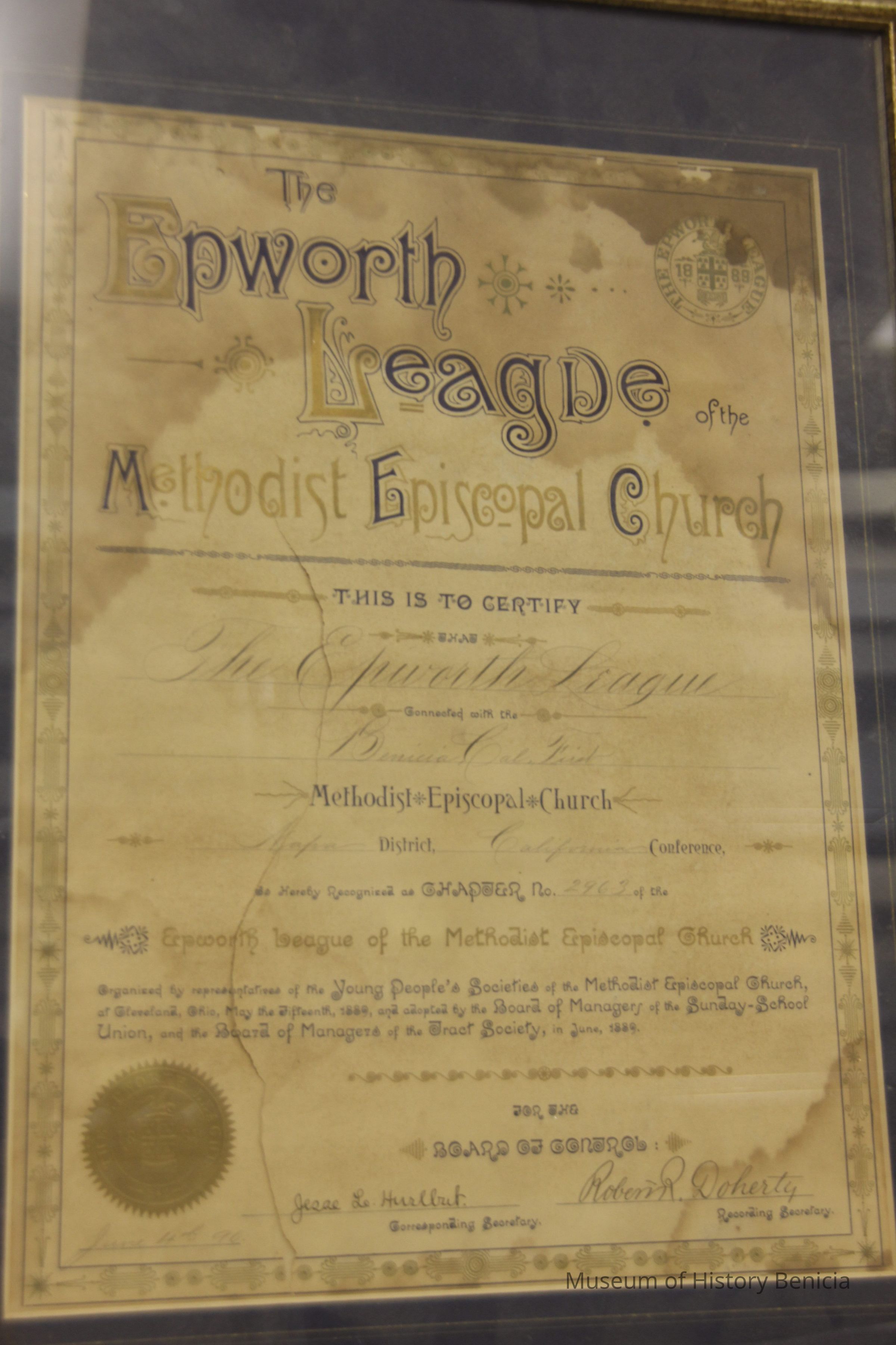 Certificate recognizing the Epworth League of the Episcopol Methodist church of Benicia California. (There is a photo of this certificate at 1984.001.0007.047a.) The Epworth League was founded in 1889 in Cleveland, Ohio.Collection
