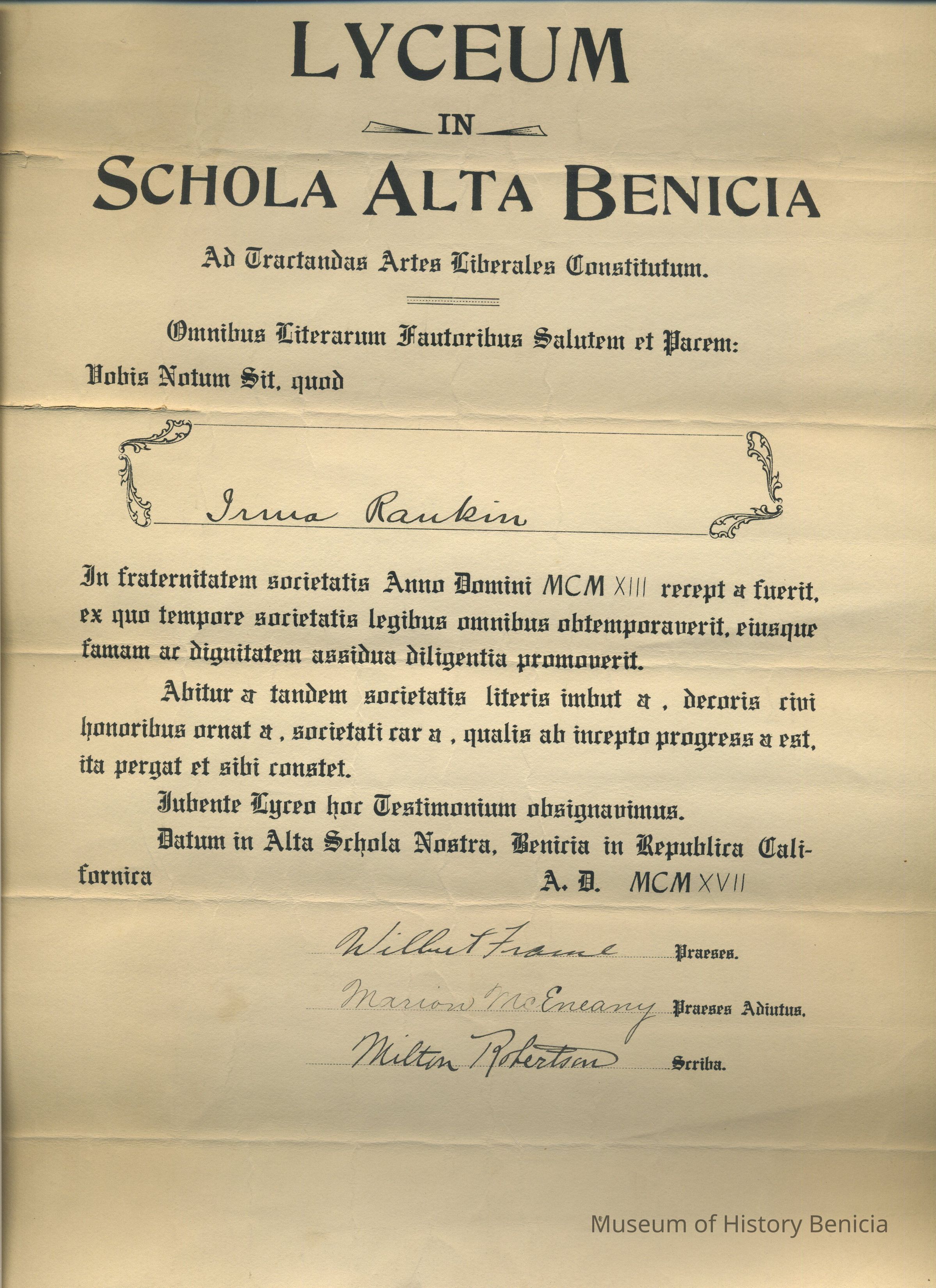 This certificate is for Irma Rankin, and is dated MCMXVII (1917)