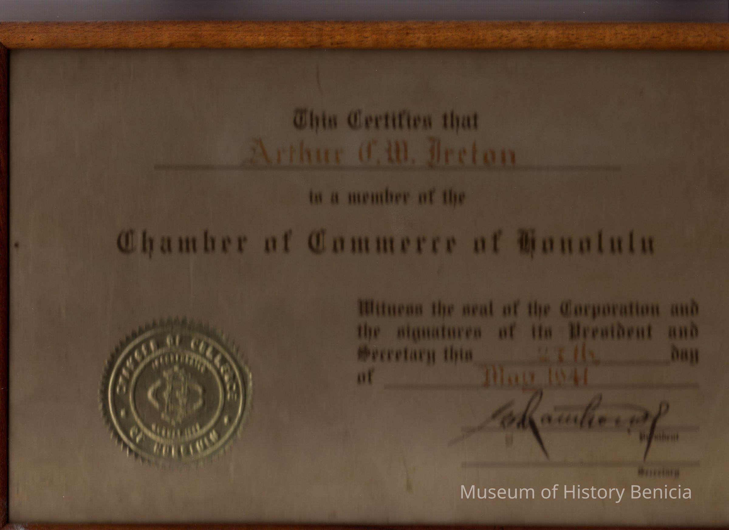 Certificate of membership presented to Arthur C.W. Dreton to honor him as a member of the Chamber of Commerce of Honolulu.