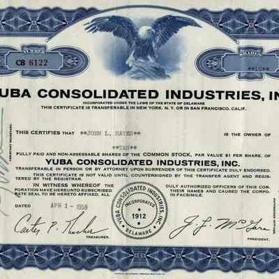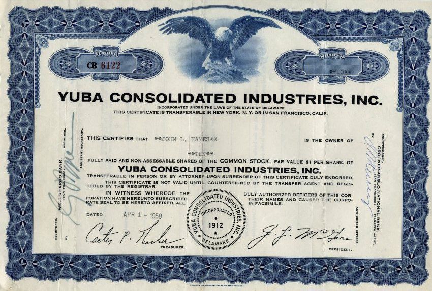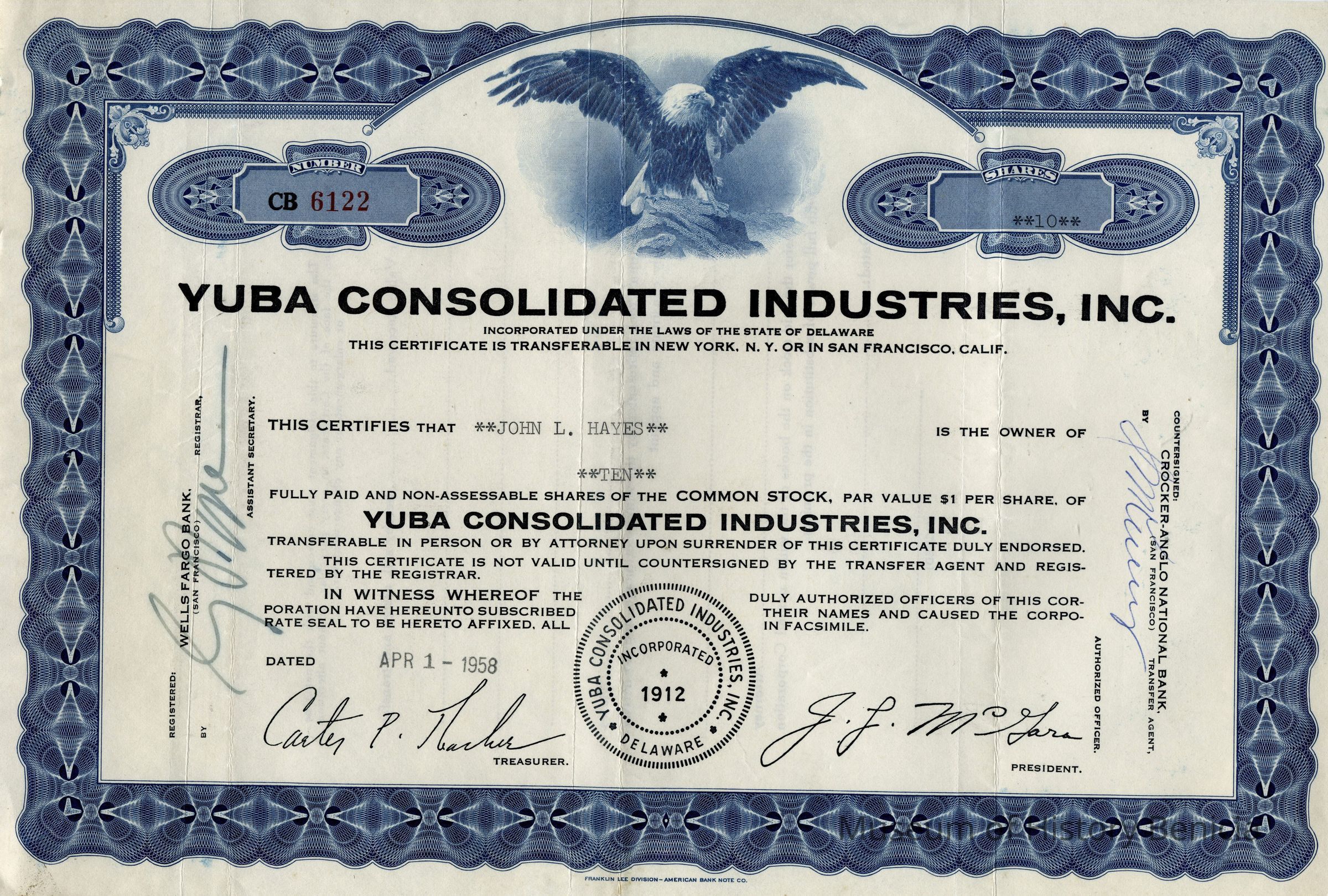 This is a stock certificate for Yuba Consolidated Industries, Inc. It is for 10 shares and was issued 04/01/1958 to John L. Hayes. It is numbered CB 6122.