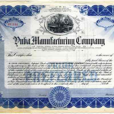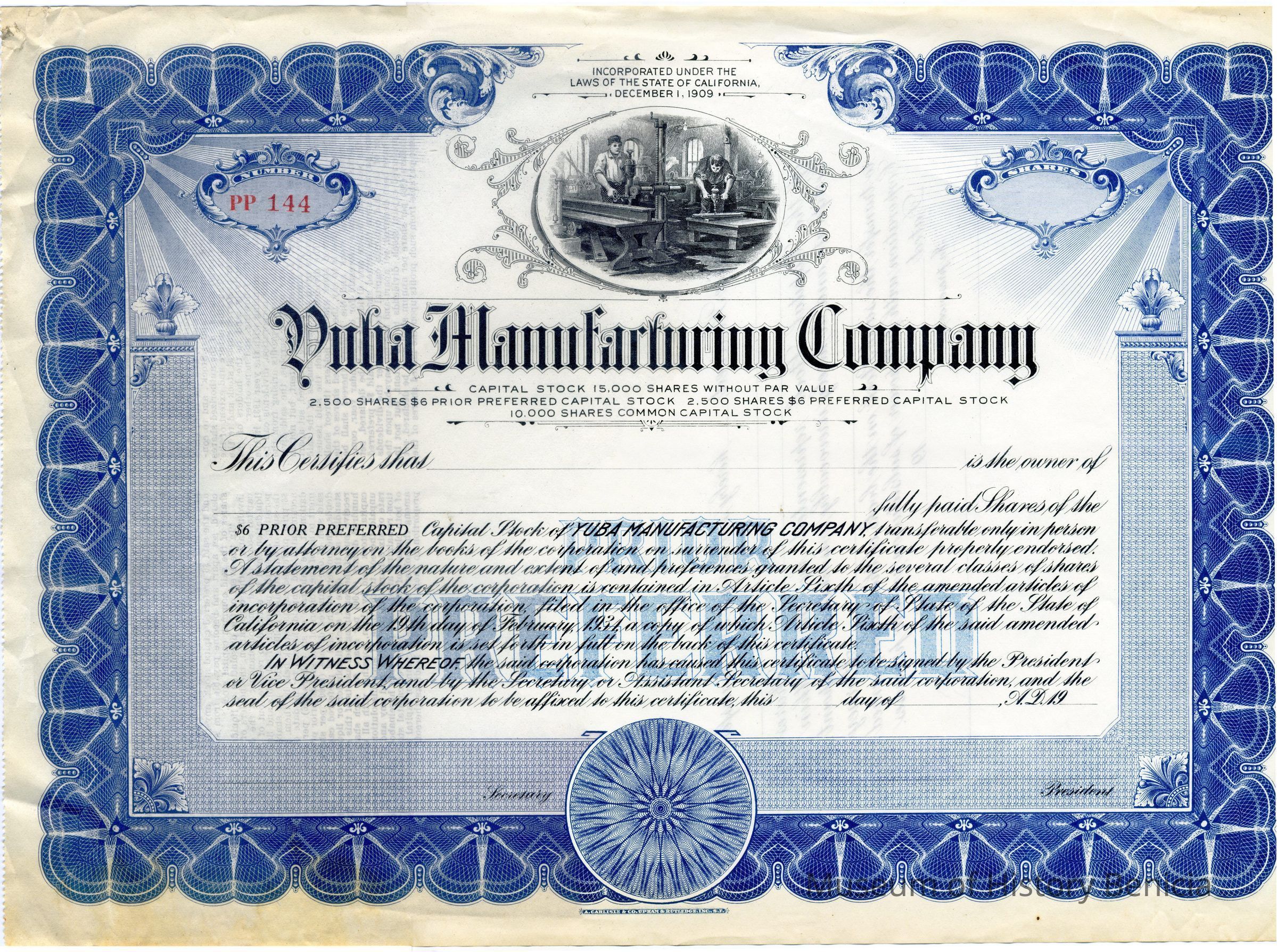 This is a blank stock certificate for Yuba Manufacturing Company. It says the company was incorporated inCalifornia in 12/1909. The certificate has a number, PP 144 but has not been assigned to any person. It is for "$6 prior preferred" stock.