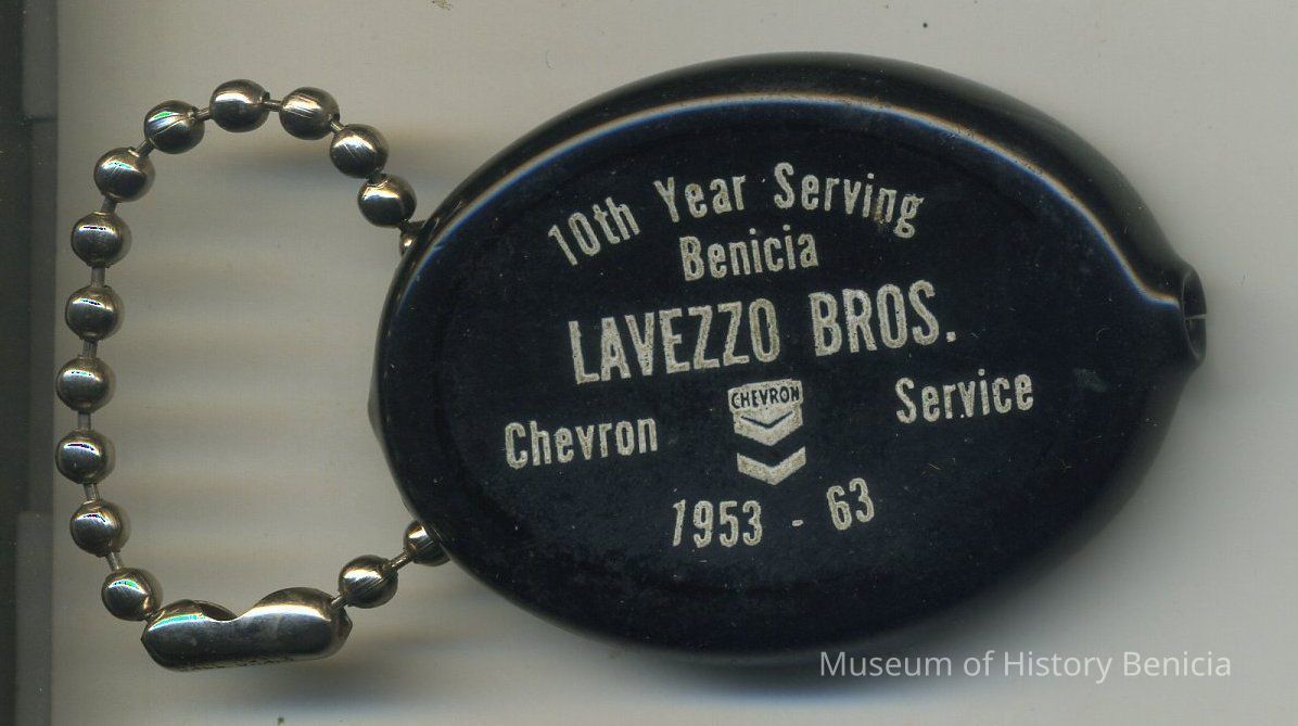 Advertising piece - Key Chain with a small, black, vinyl oval that has a cut in the top side; when ends are squeezed the oval opens to hold coins (or other small items); white lettering on the bottom: "10th Year Serving Benicia / Lavezzo Bros. / Chevron (logo) Service / 1953-63"; chain on one end; inside: "Quikoin" with patent numbers; 2" x 1-1/2" x 3/8".Collection